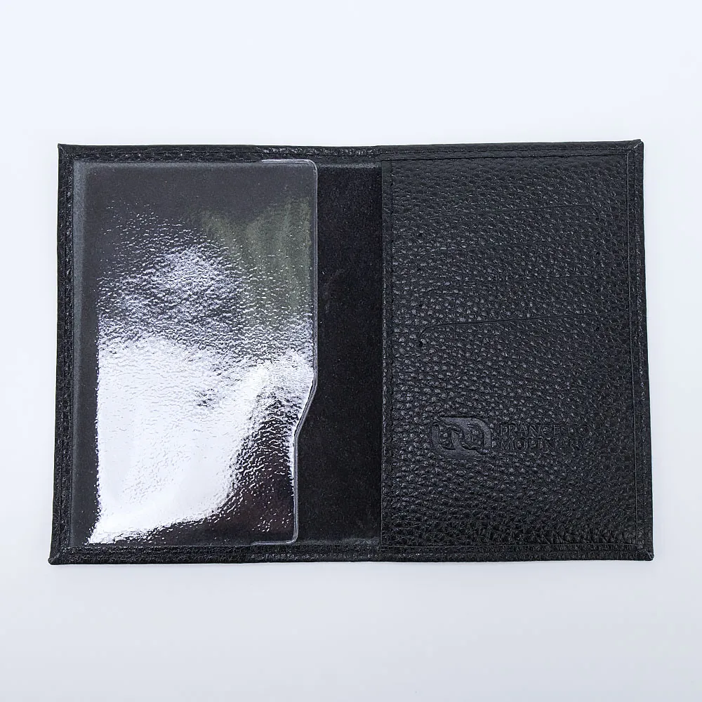 Обложка для паспорта от торговой марки Francesco Molinary из натуральной кожи черного цвета. Модель без застежки, раскрывается книжкой. Внутри – клапаны для паспорта, один из них – прозрачный.