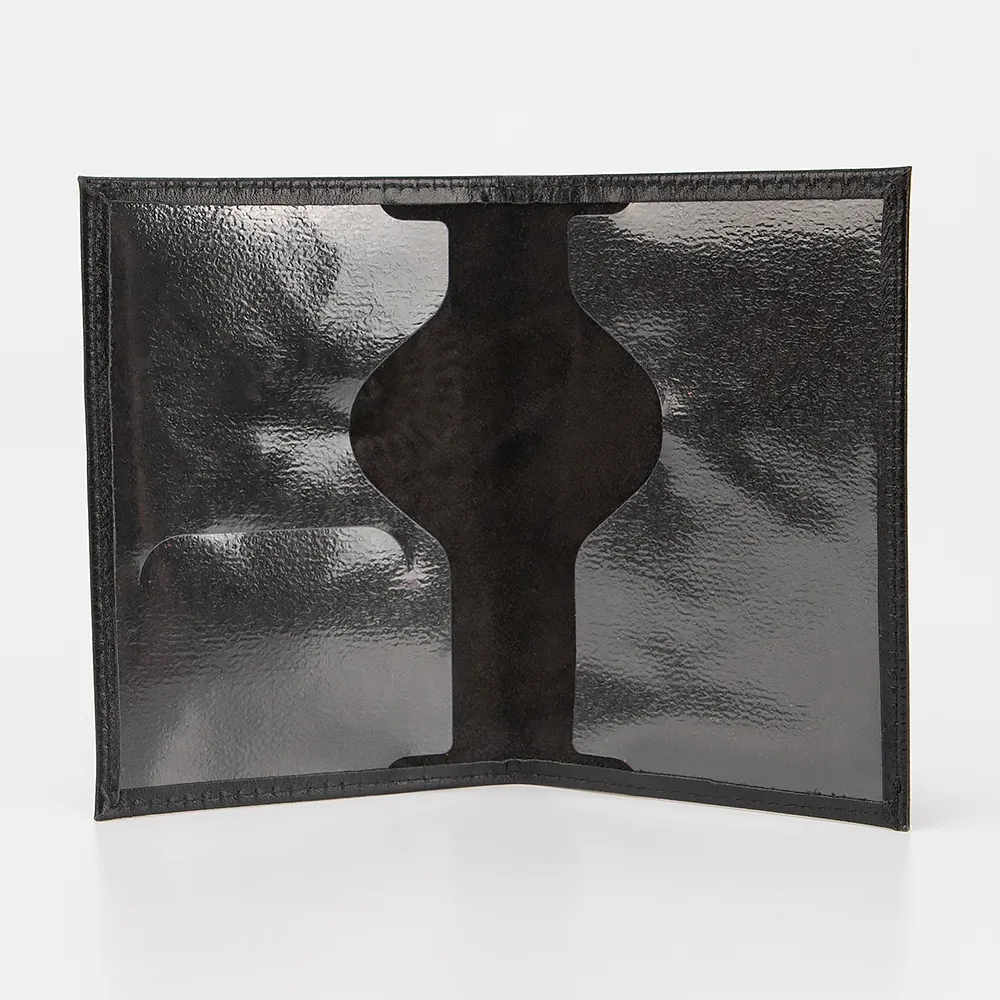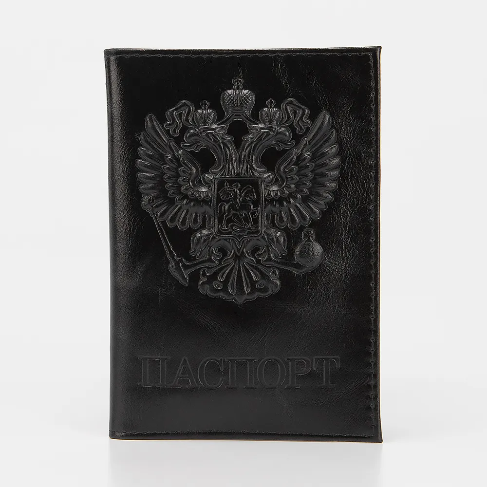 Обложка для паспорта от торговой марки Poshete выполнена из натуральной кожи черного цвета с тиснением в виде орла и надписи Паспорт. Модель раскрывается книжкой. Внутри - прозрачные клапаны.