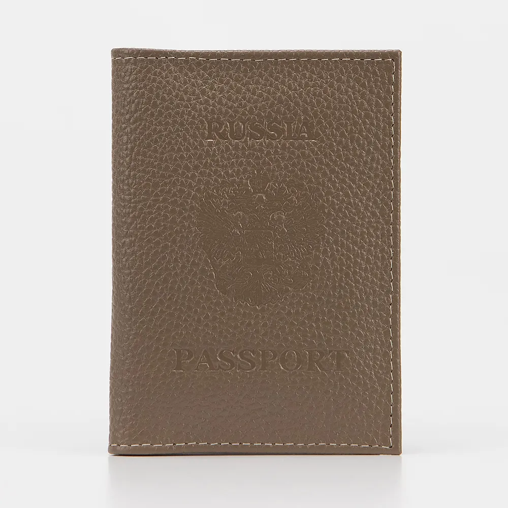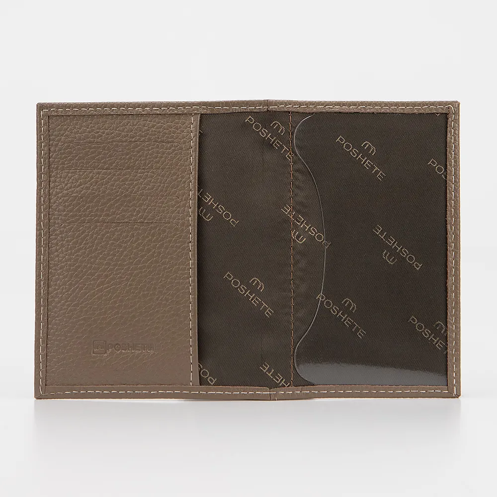 Обложка для паспорта от торговой марки Poshete выполнена из натуральной кожи кофейного цвета. Лицевая сторона декорирована тиснением с гербом России и надписью: Russia. Passport. Модель раскрывается книжкой. Внутри - карманы для карт и прозрачный клапан. Снаружи имеется карман без застежки.