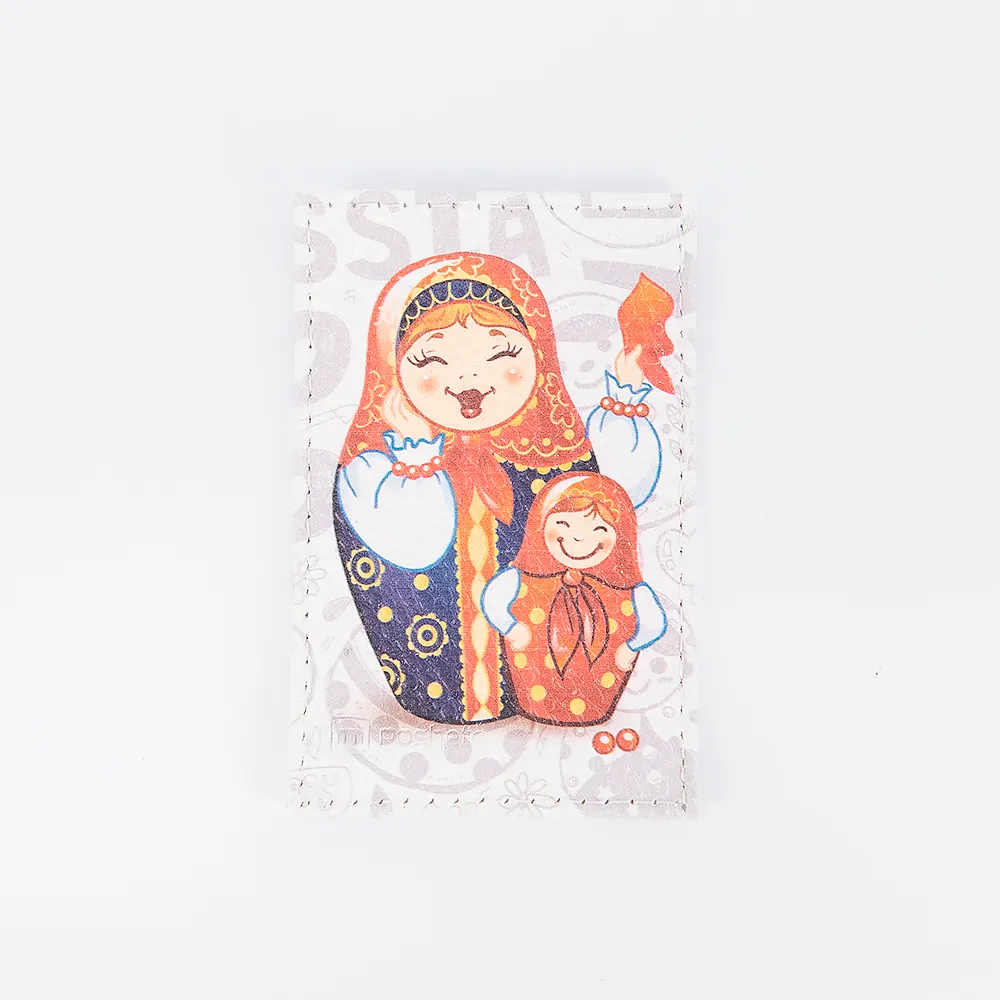 Чехол для пропуска от торговой марки Poshete из натуральной кожи. Декорирован принтом с изображением матрешки. Модель с прозрачным клапаном.