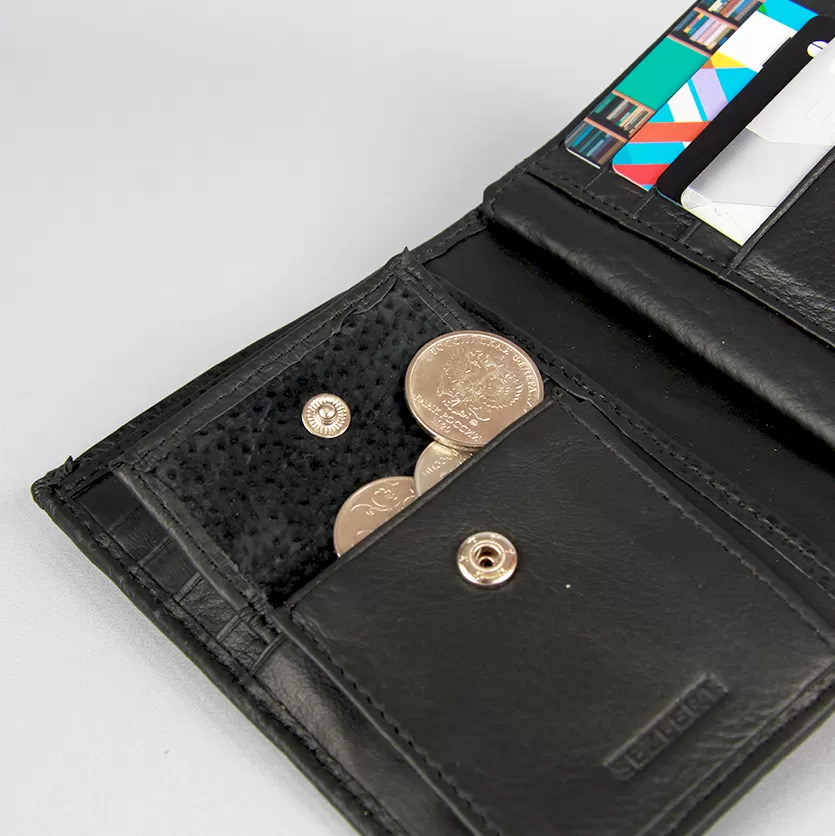 - Три отделения для купюр, одно из которых закрывается на молнию