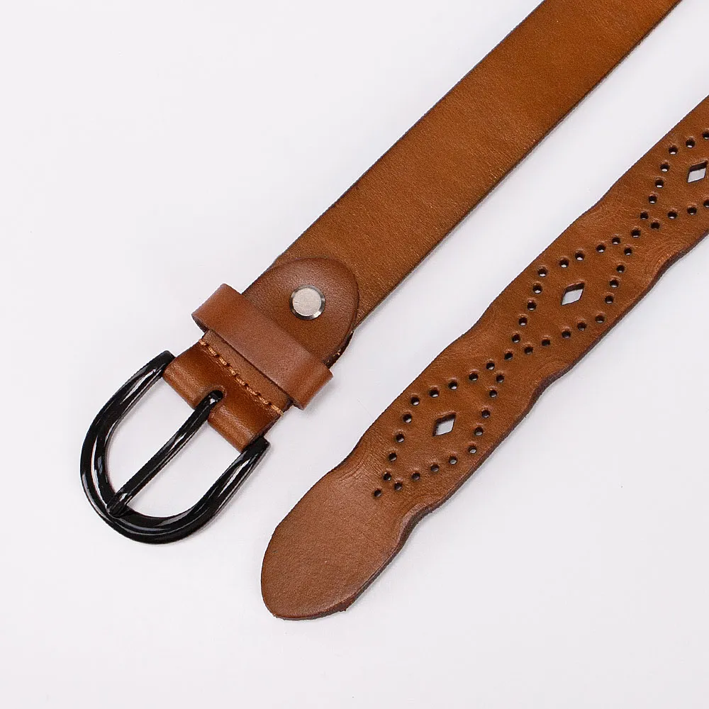 Стильный женский ремень от бренда Poshete выполнен из натуральной толстой кожи, украшен перфорацией, края волнистые. Ремень тёмно-голубого цвета, ширина 3 см, длина 95-105 см. Стальная овальная пряжка с «язычком», одна шлёвка и классические отверстия для фиксации объёма, на конце овальной формы.