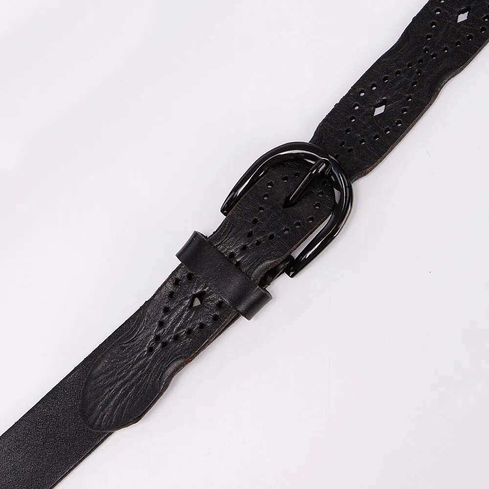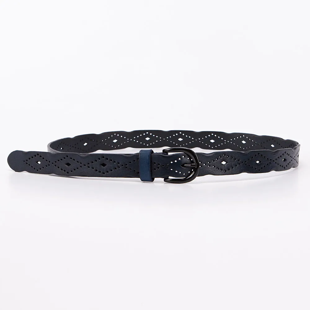 Стильный женский ремень от бренда Poshete выполнен из натуральной толстой кожи, украшен перфорацией, края волнистые. Ремень тёмно-голубого цвета, ширина 3 см, длина 95-105 см. Стальная овальная пряжка с «язычком», одна шлёвка и классические отверстия для фиксации объёма, на конце овальной формы.