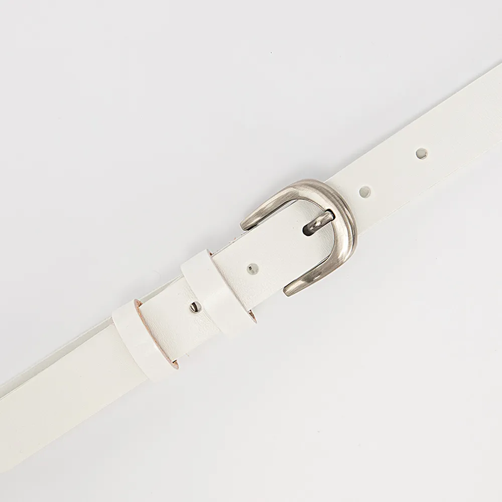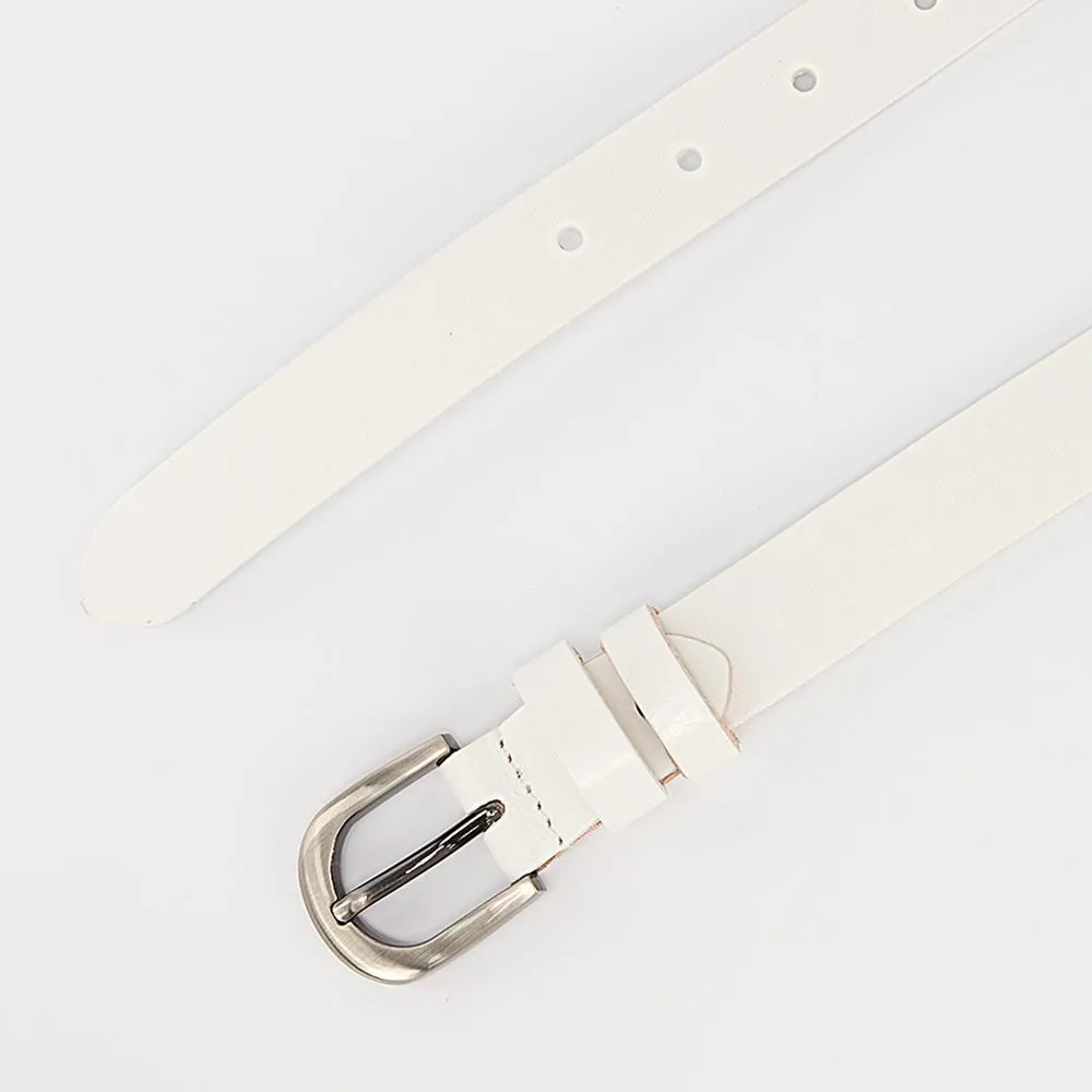 Женский ремень от торговой марки Poshete из натуральной кожи белого цвета. Модель длиной 95-105 см, шириной 2,5 см. Металлическая пряжка; шлевка для фиксации. Размер: S.