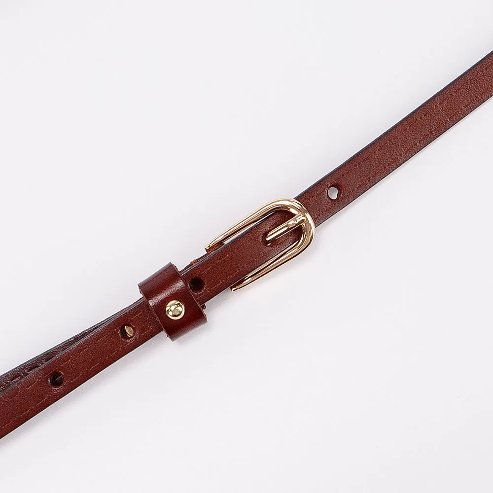 Утончённый женский ремень от бренда Poshete выполнен из натуральной кожи, с оборотной стороны замшевый, украшен перфорацией. Ремень коричневого цвета, ширина 9 мм, длина 111-115 см. Металлическая пряжка овальной формы с классическим «язычком» золотого цвета. Объём регулируется с помощью круглых отверстий, на ремне есть шлёвка для дополнительной фиксации.