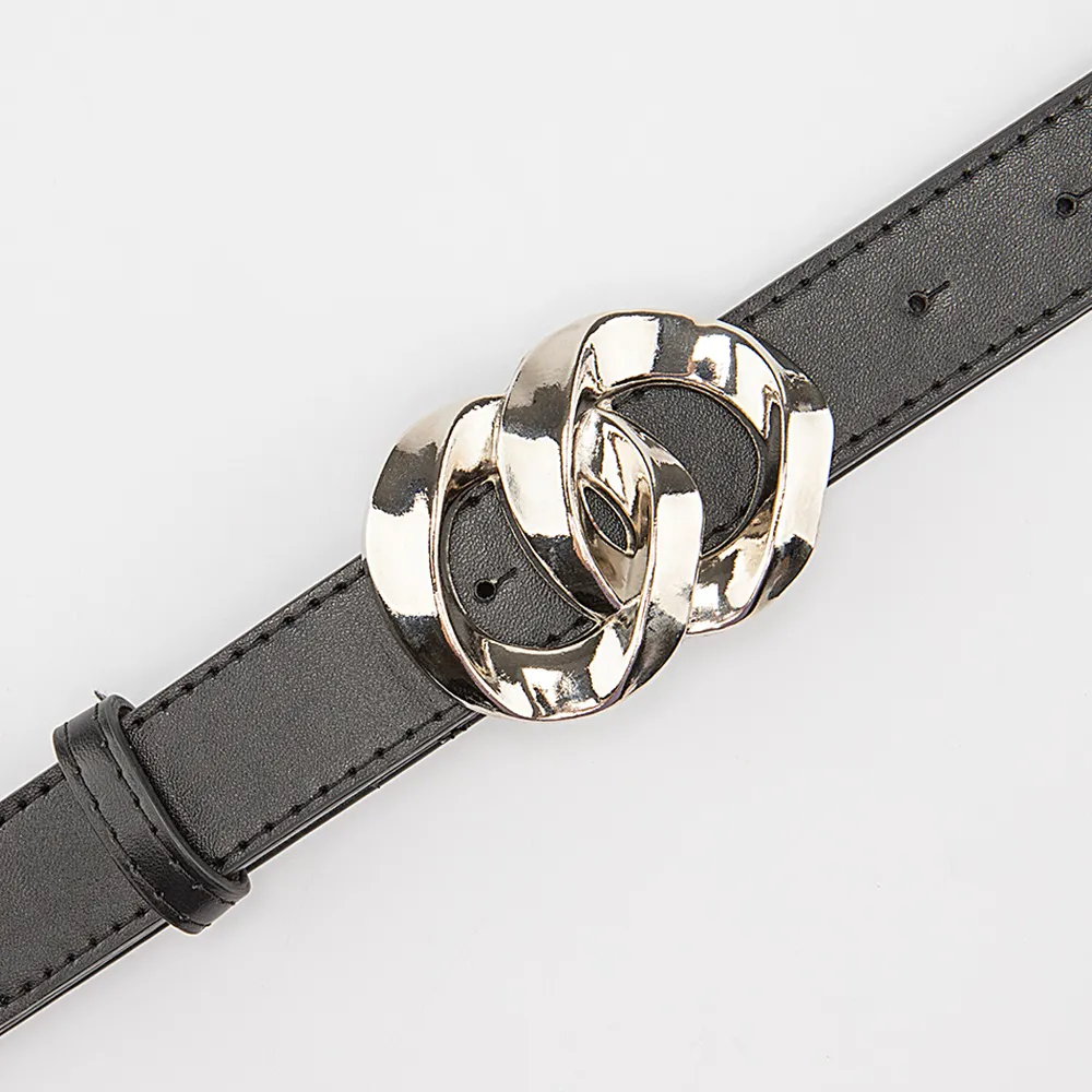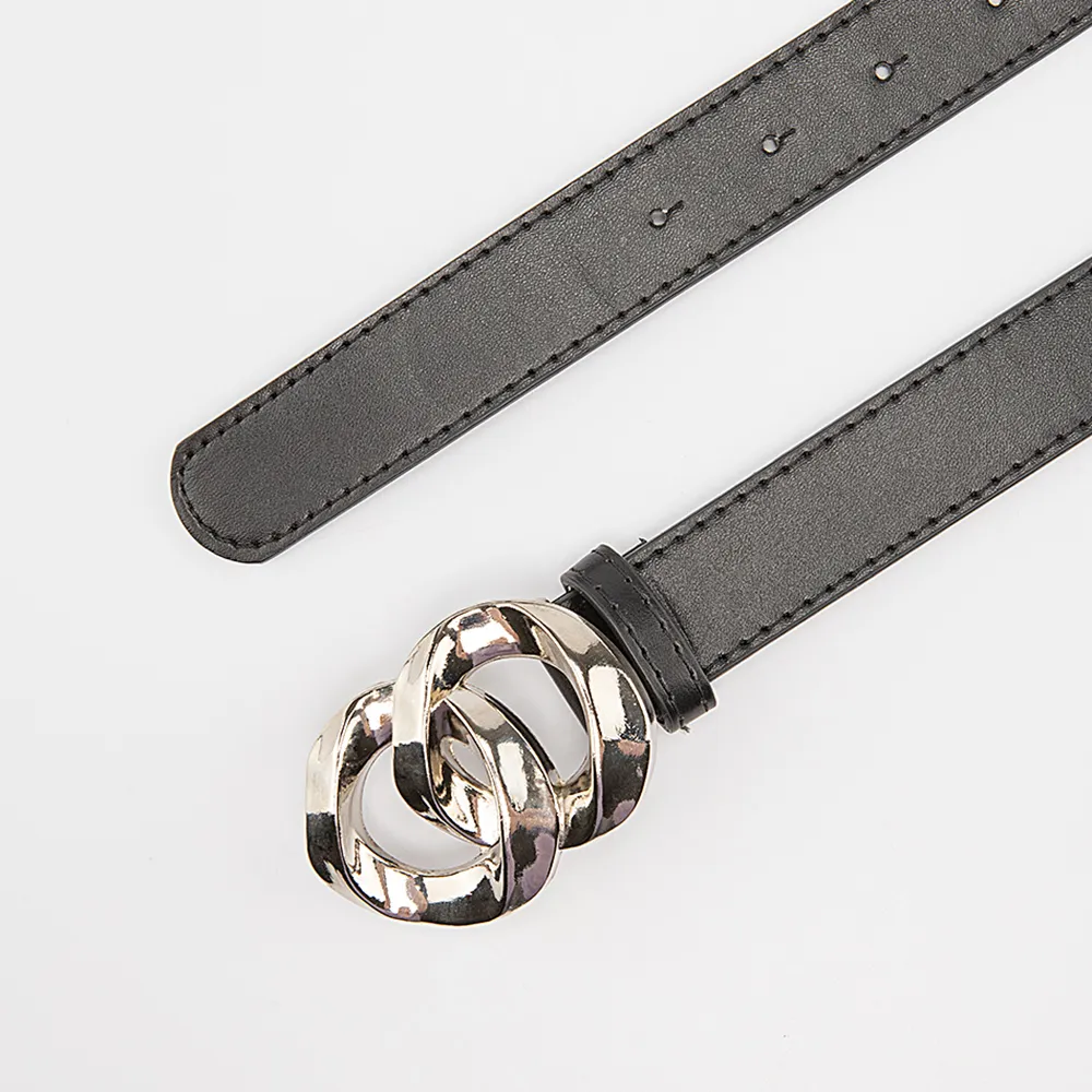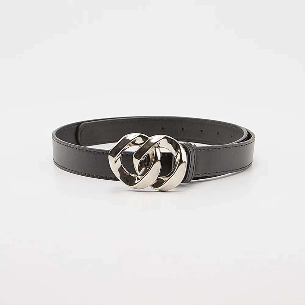 Ремень из искусственной кожи черного цвета. Модель шириной 30 мм, длиной 100 см, с металлической пряжкой в виде двух колец.