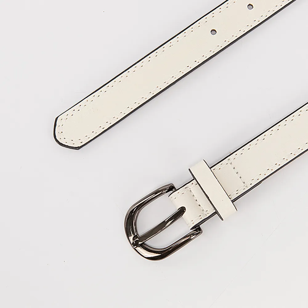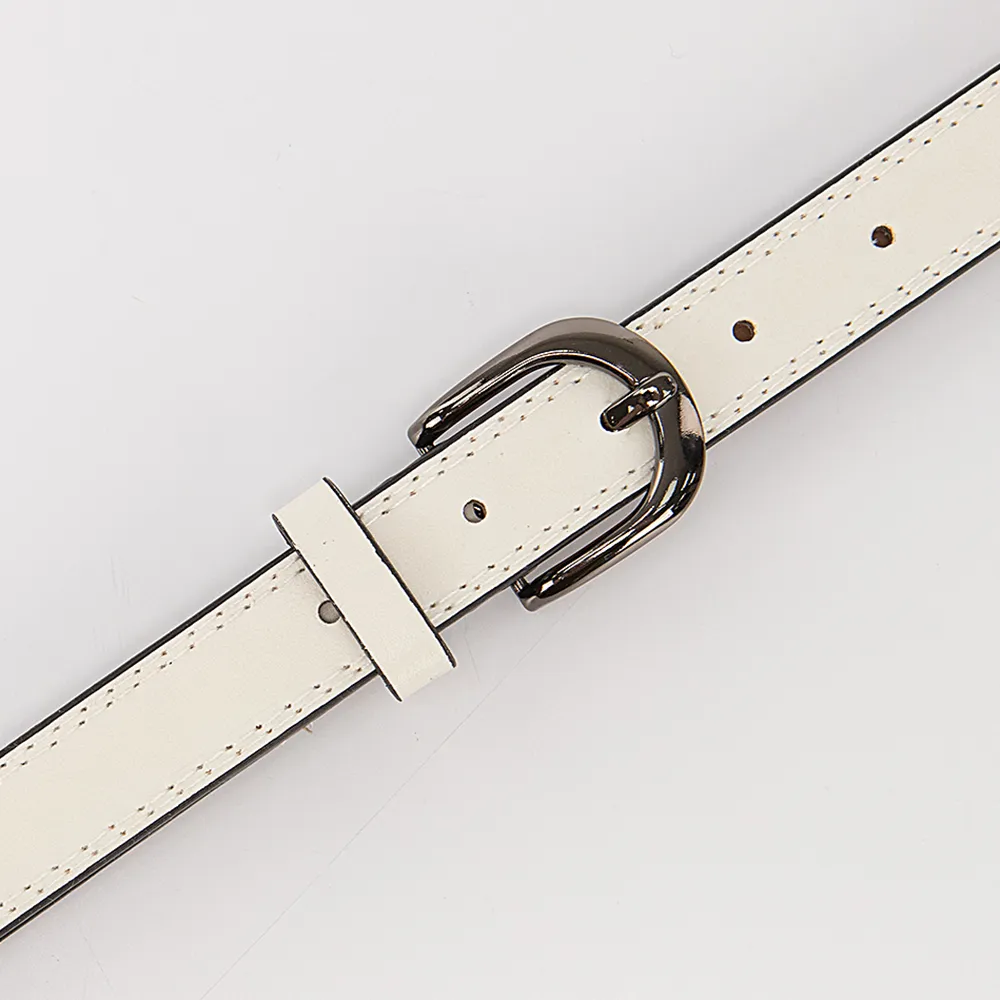Ремень из искусственной кожи белого цвета. Модель шириной 2,5 см, длиной 100 см; с закругленной металлической пряжкой и шлевкой, с контрастными срезами.