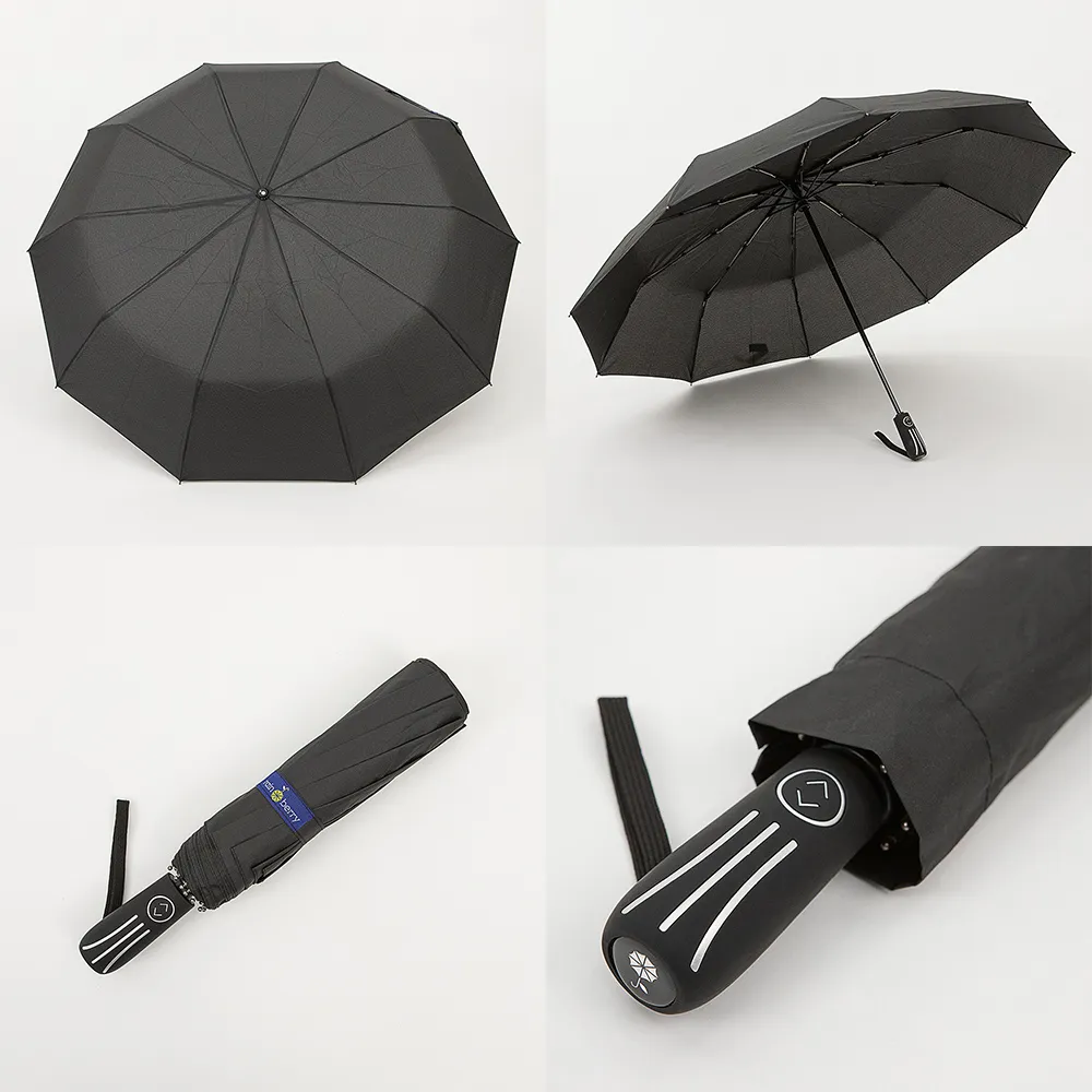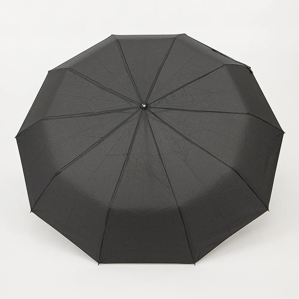 Мужской складной зонт-автомат от торговой марки Rain Berry с материалом купола из эпонжа черного цвета. Модель имеет 3 сложения, функцию «антиветер», 10 спиц, радиус купола 63 см. Прямая ручка.