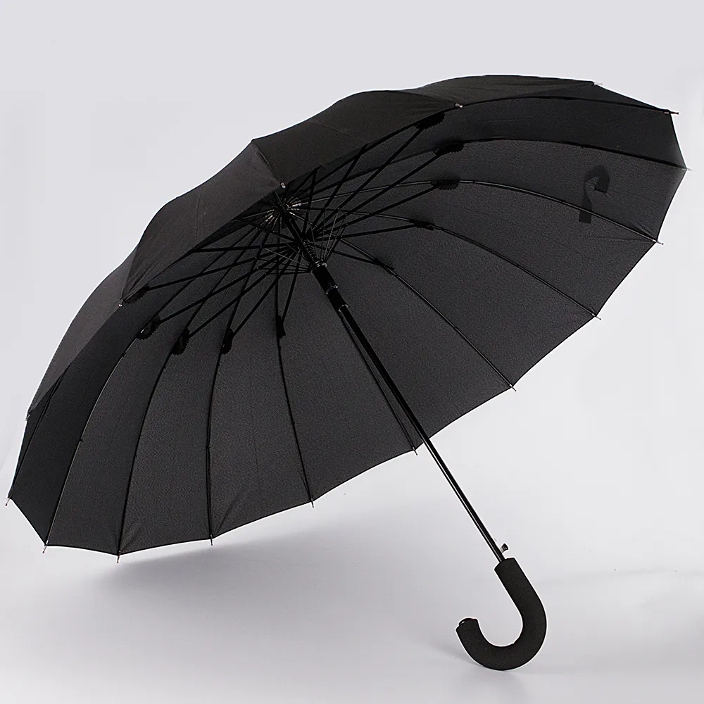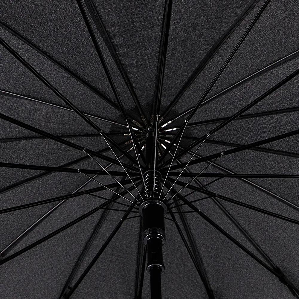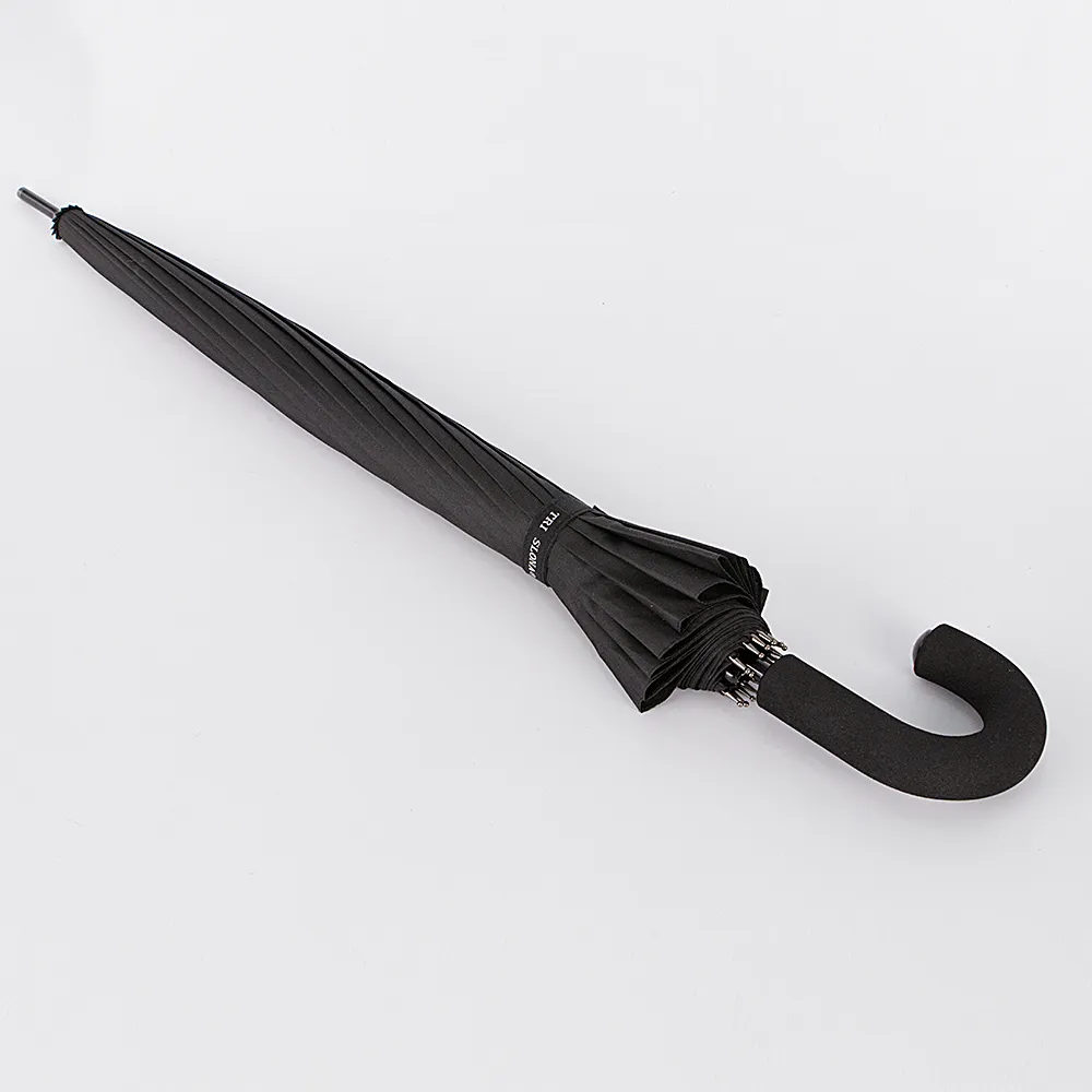 Зонт-трость от торговой марки «Tri slona» с однотонным куполом из тефлоновой ткани черного цвета. Модель имеет 16 спиц, радиус купола 65 см, диаметр – 130 см, ручка-крюк выполнена из пластика и полимера EVA. Материал каркаса из стали и фибергласса. Длина в сложении – 85 см.