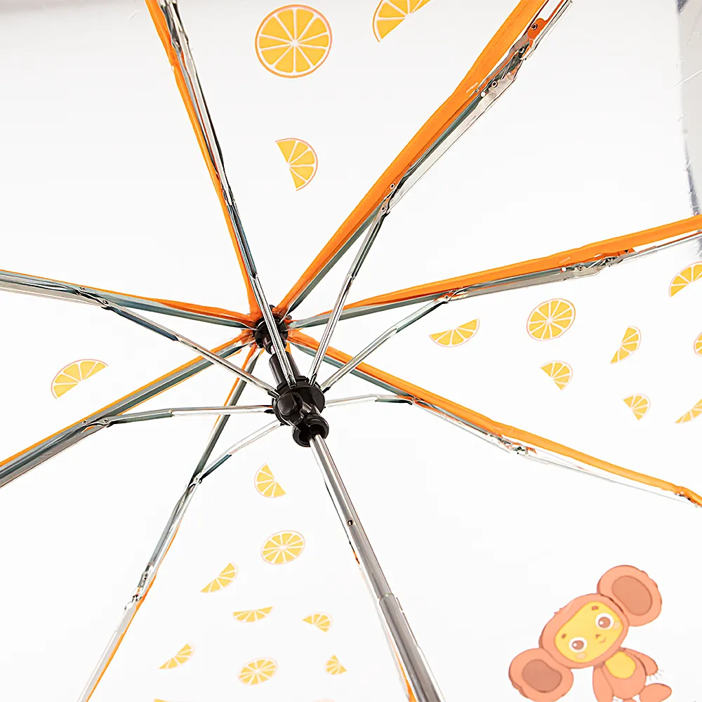 Складной механический зонт с материалом купола из ПВХ и нейлона. Прозрачный купол декорирован рисунком с Чебурашкой и апельсинами. Модель имеет 3 сложения, 8 спиц, диаметр купола – 98 см. Ручка прямая пластиковая. Длина в сложенном виде – 24,5 см.