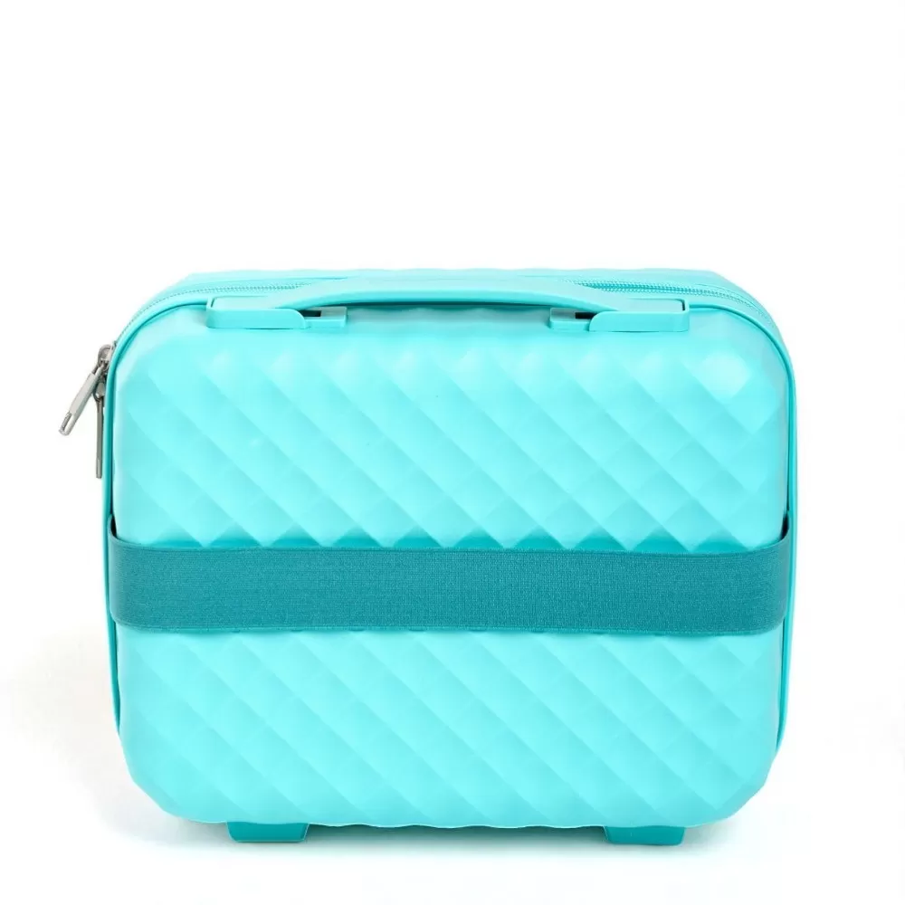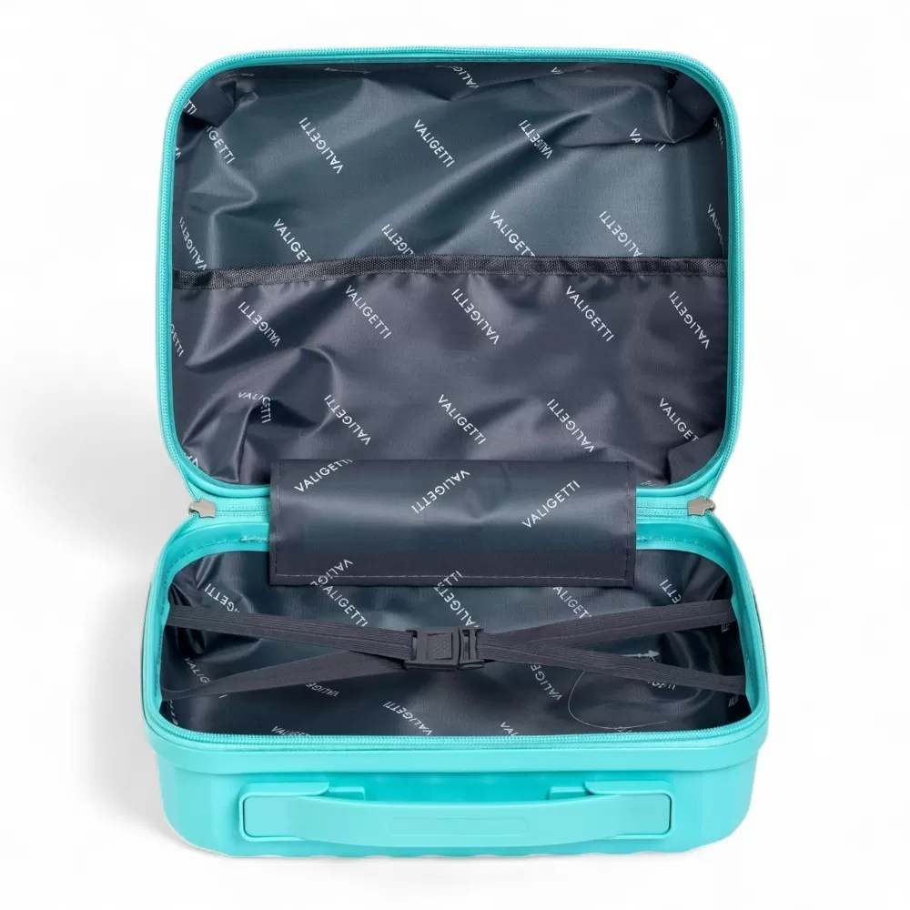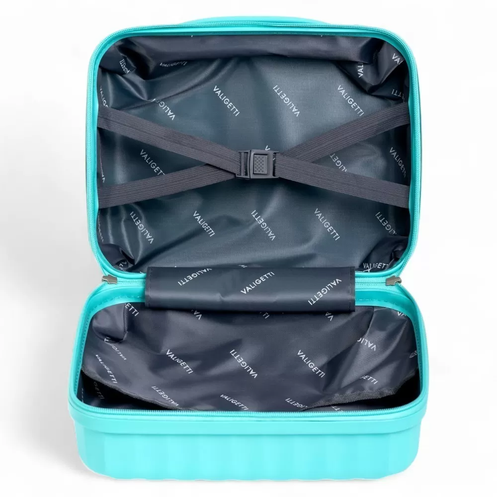 Бьюти-кейс Valigetti выполнен из ударопрочного и термостойкого полипропилена. У кейса рельефная антивандальная поверхность. Модель представлена в бирюзовом цвете. Есть прорезиненная ручка и пластиковые ножки. Застежка — молния. Внутри кейса текстильная подкладка. В одной части — перекрестные ремни для фиксации косметики, в другой — накладной карман. На задней стороне кейса лямка-резинка для крепления к выдвижной ручке чемодана.
