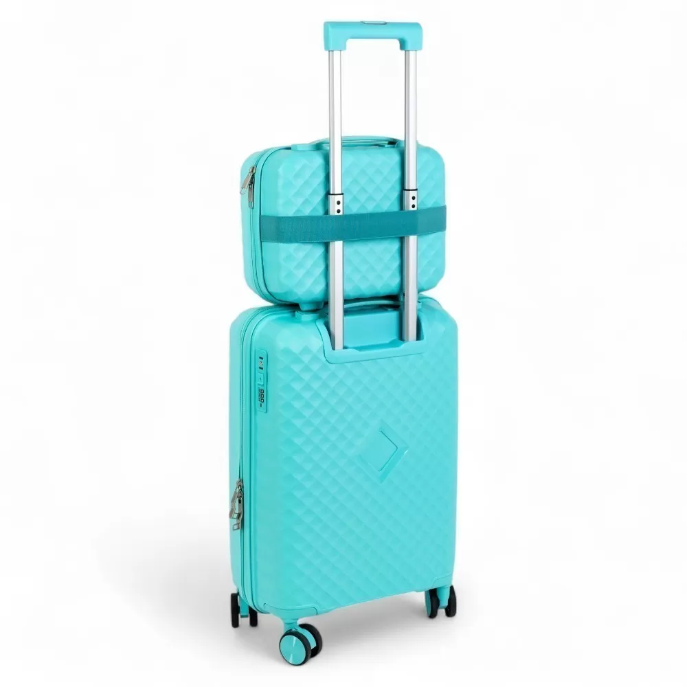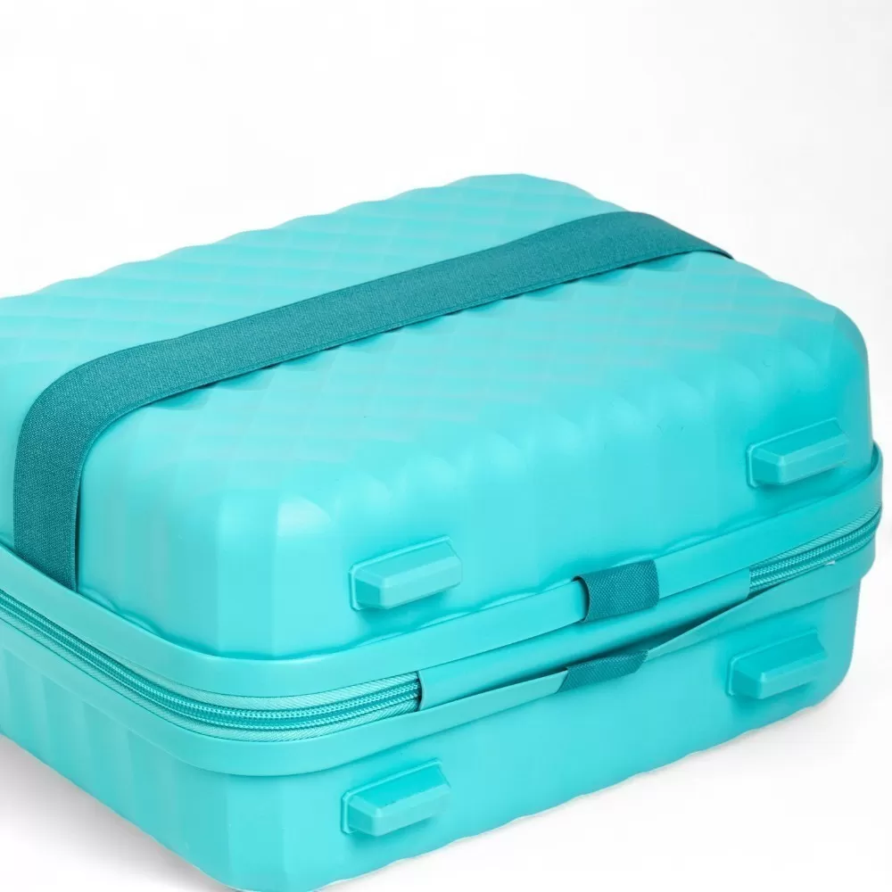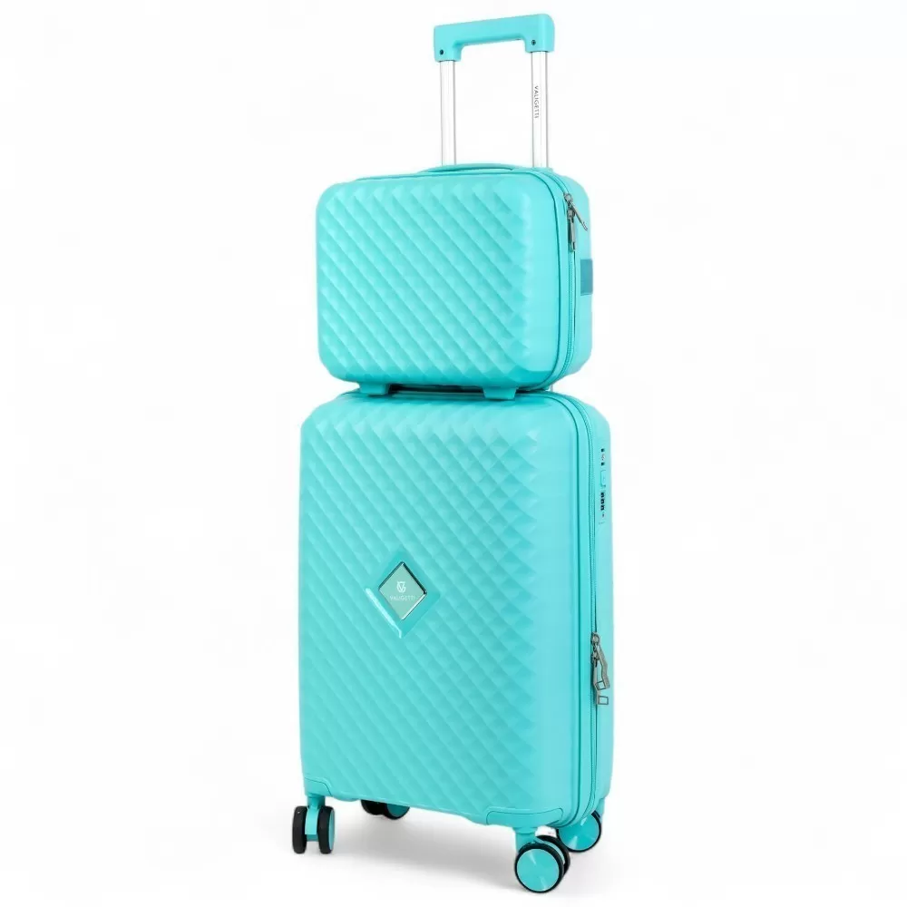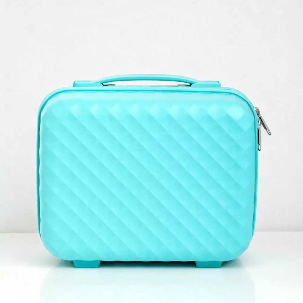 Бьюти-кейс Valigetti выполнен из ударопрочного и термостойкого полипропилена. У кейса рельефная антивандальная поверхность. Модель представлена в бирюзовом цвете. Есть прорезиненная ручка и пластиковые ножки. Застежка — молния. Внутри кейса текстильная подкладка. В одной части — перекрестные ремни для фиксации косметики, в другой — накладной карман. На задней стороне кейса лямка-резинка для крепления к выдвижной ручке чемодана.