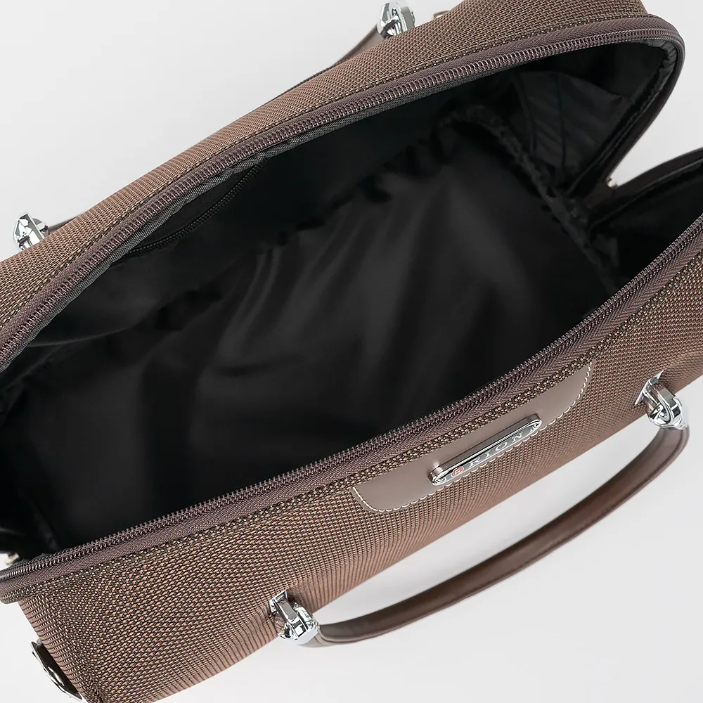 Бьюти-кейс от торговой марки Rion из текстильного материала коричневого цвета с принтом в клетку. Модель с двумя удлиненными ручками и лямкой для крепления на выдвижную ручку чемодана. Закрывается молнией по трем сторонам со встречными бегунками.