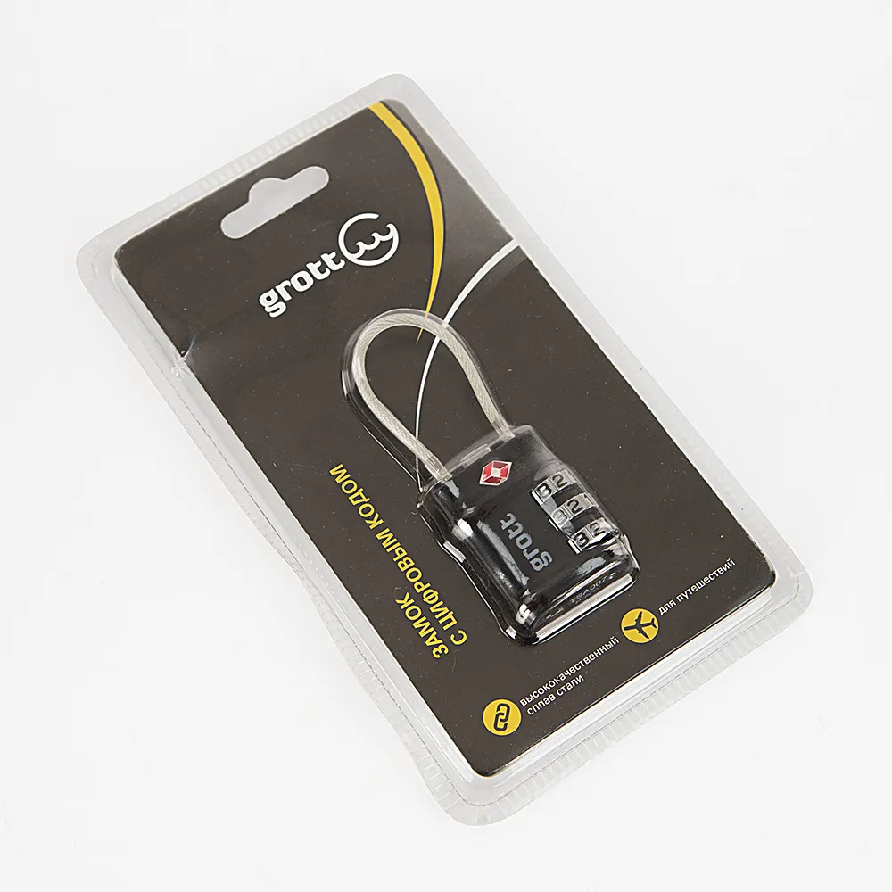 Навесной кодовый замок от торговой марки Grott. Модель из высококачественной стали, с гибким тросом, с цифровым кодом TSA.