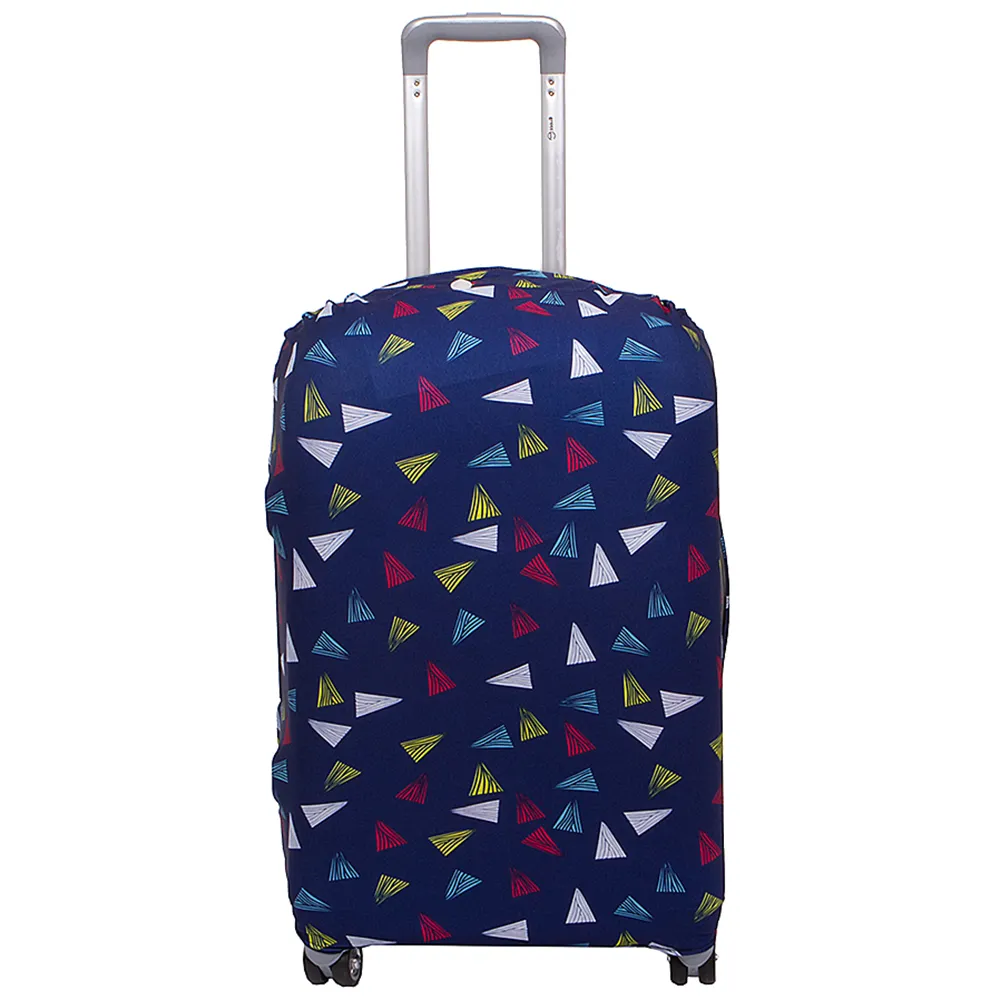 Практичный износостойкий чехол для чемодана от бренда Grott выполнен из прочного текстиля. Дорожный аксессуар поможет предохранить багаж от загрязнений, вскрытий и мелких повреждений. Чехол эластичный, подходит для чемоданов с диагональю от 18 до 22 дюймов. Застегивается снизу на липучку и дополнен эластичным ремешком с фастексом, имеет отверстия слева и справа для переносных ручек и сверху для выдвижной ручки чемодана. Принт в виде разноцветных треугольных элементов на тёмно-синем фоне поможет быстро опознать свой чемодан на багажной ленте в аэропорту.