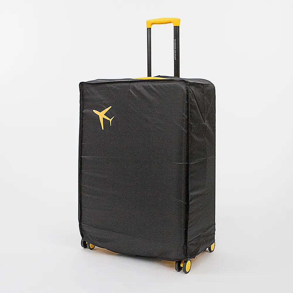 Чехол для чемодана от торговой марки Grott из текстильного материала. Декорирован принтом с изображением самолета. Модель для чемоданов с диагональю от 26 до 28 дюймов; снизу застегивается на липучку, имеет прорези для ручек багажа по бокам и сверху. Дорожный аксессуар поможет предохранить багаж от загрязнений, вскрытий и мелких повреждений. Размер: L.