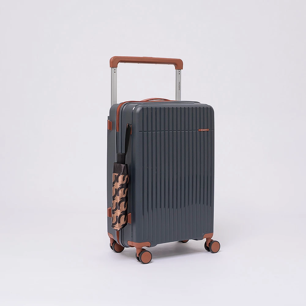 Чемодан-спиннер от бренда Valigetti выполнен из ударопрочного термостойкого полипропилена с антивандальной рельефной поверхностью серого цвета с коричневыми элементами. Модель на четырех сдвоенных пластиковых колесах, с широкой телескопической ручкой, ручкой-переноской сверху и сбоку, пластиковыми ножками для защиты от износа. Закрывается молнией №8 «антивор», имеется кодовый замок, утопленный в корпус. Внутри: фирменная подкладка, в одной части перекрестные ремни для фиксации багажа, в другой — клапан-разделитель на молнии, карман-сетка на молнии. Верхние ножки выполнены в виде крючков для подвешивания.