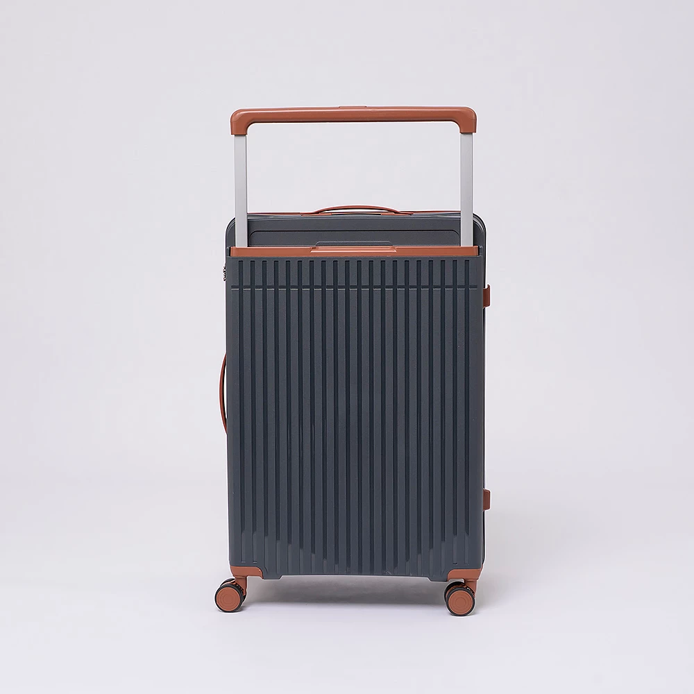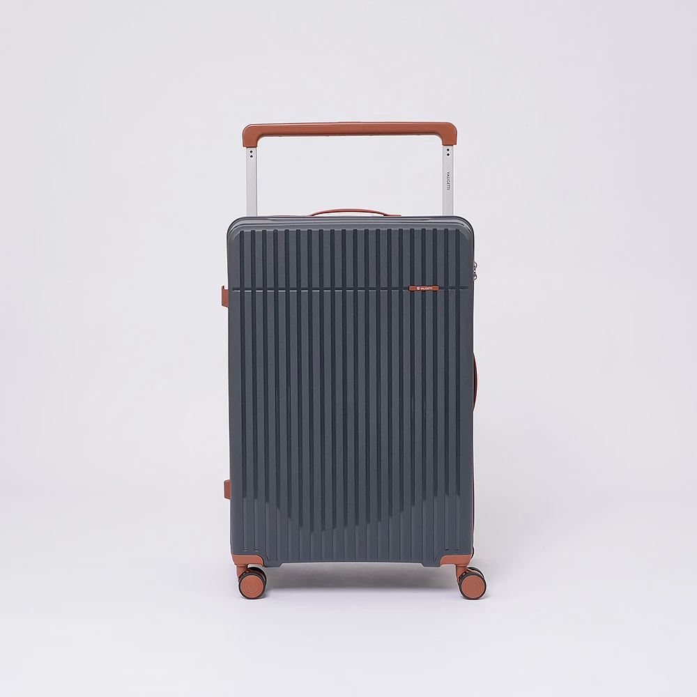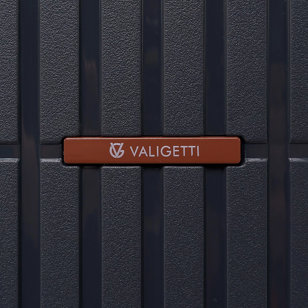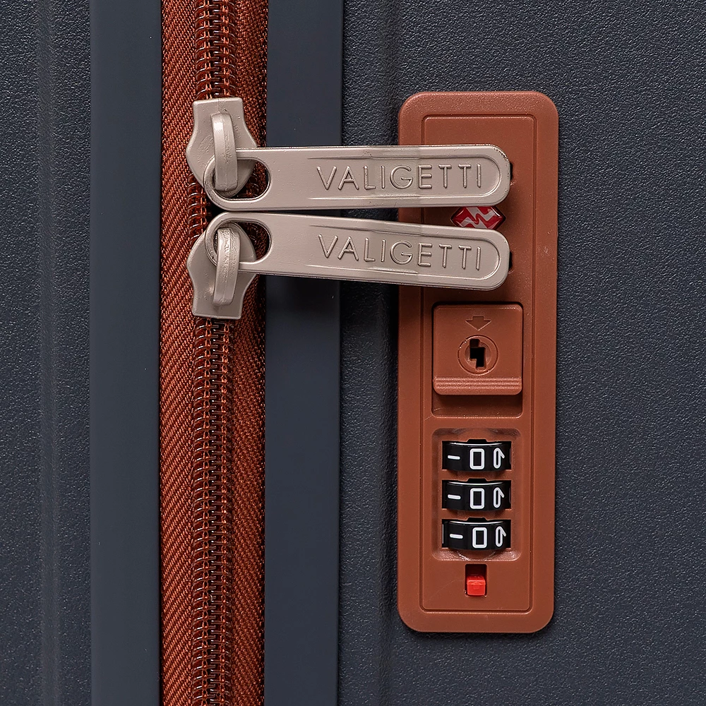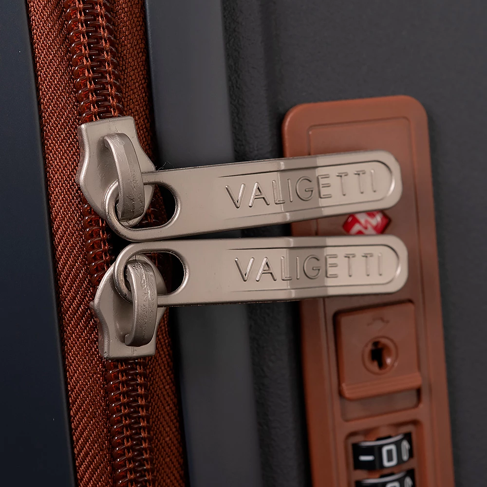 Чемодан-спиннер от бренда Valigetti выполнен из ударопрочного термостойкого полипропилена с антивандальной рельефной поверхностью серого цвета с коричневыми элементами. Модель на четырех сдвоенных пластиковых колесах, с широкой телескопической ручкой, ручкой-переноской сверху и сбоку, пластиковыми ножками для защиты от износа. Закрывается молнией №8 «антивор», имеется кодовый замок, утопленный в корпус. Внутри: фирменная подкладка, в одной части перекрестные ремни для фиксации багажа, в другой — клапан-разделитель на молнии, карман-сетка на молнии. Верхние ножки выполнены в виде крючков для подвешивания.