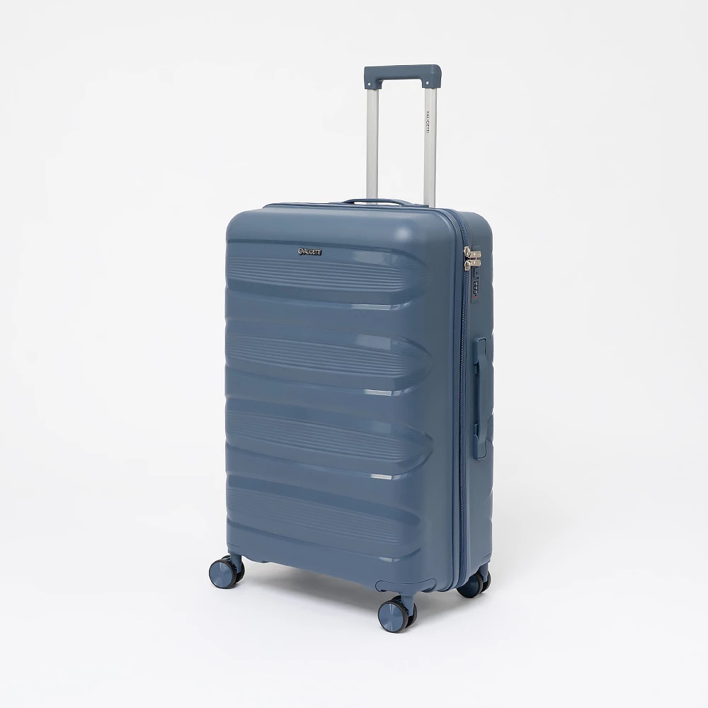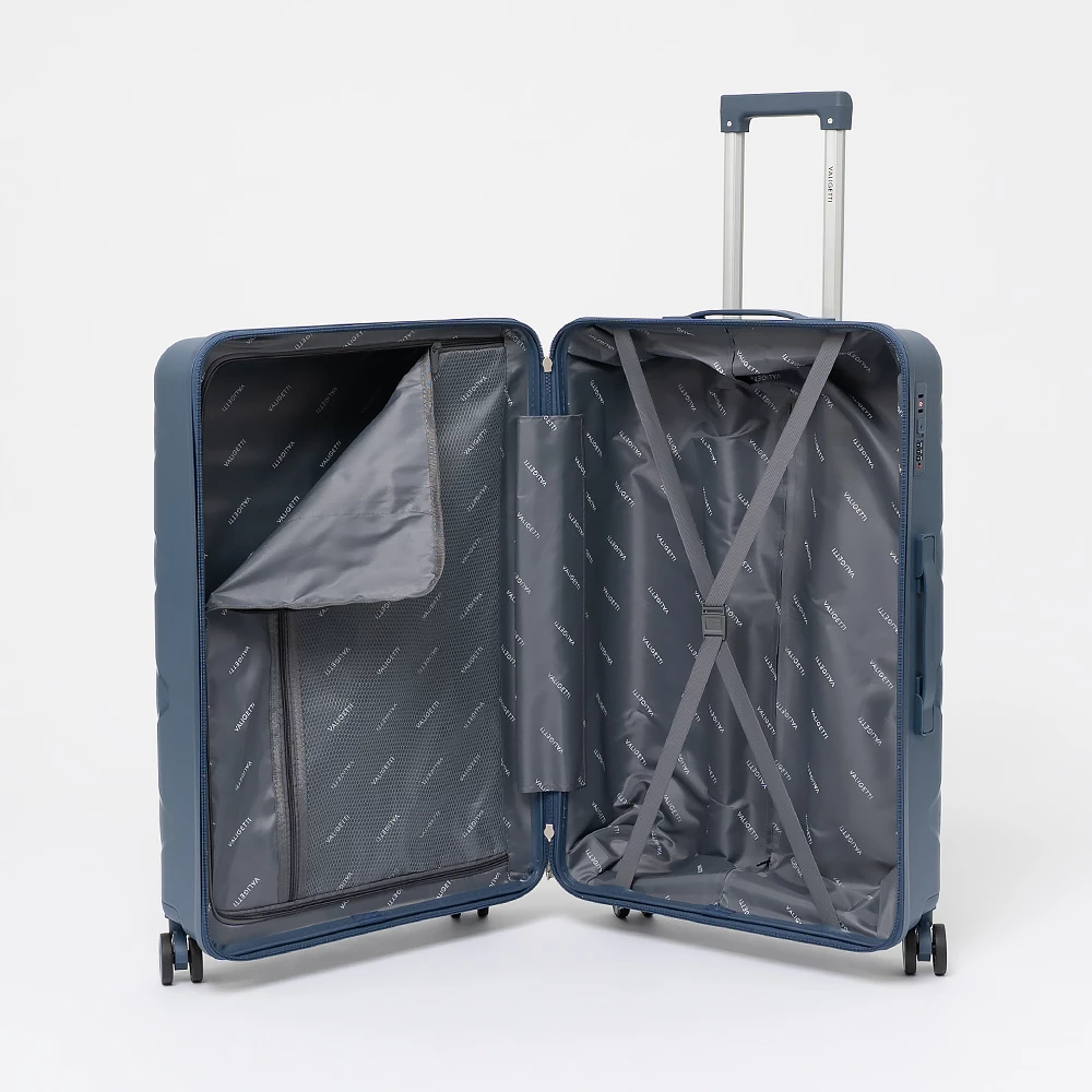 Чемодан-спиннер от бренда Valigetti из ударопрочного термостойкого полипропилена с рельефной антивандальной поверхностью синего цвета. Модель на четырех сдвоенных колесах, с выдвижной ручкой, ручками-переносками сверху и сбоку, пластиковыми ножками сбоку для защиты от износа. Закрывается молнией №8 «антивор», имеется кодовый замок, утопленный в корпус. Внутри: фирменная подкладка, в одной части — клапан-разделитель на молнии, карман-сетка на молнии, в другой части — перекрестные ремни для фиксации багажа. На верхних боковых ножках предусмотрены крючки для подвешивания пакетов.