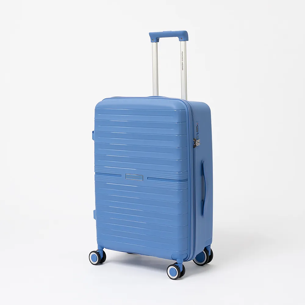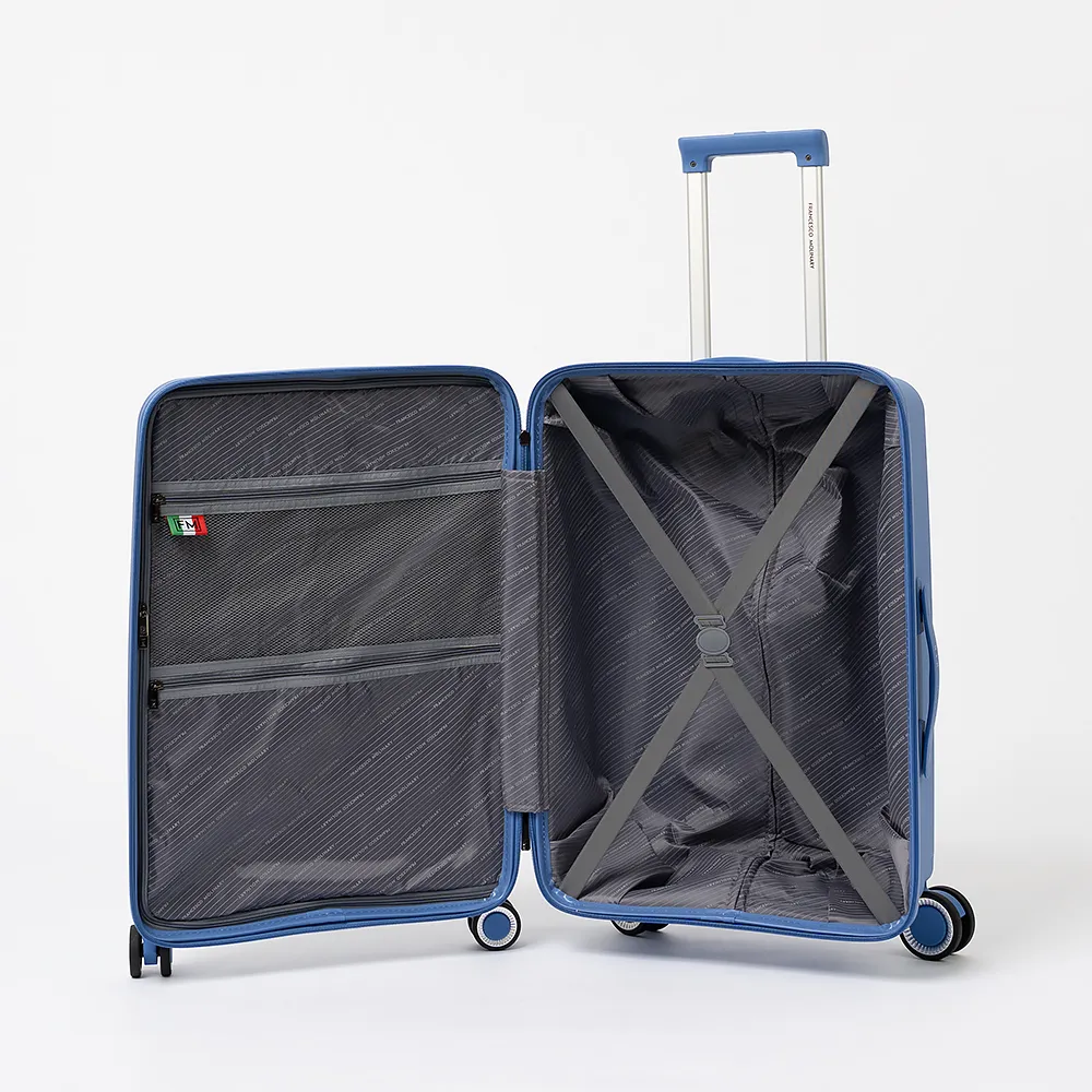 Чемодан-спиннер от торговой марки Francesco Molinary из ударопрочного термостойкого полипропилена с антивандальной узорной поверхностью синего цвета. Модель на четырех сдвоенных пластиковых колесах (задние колеса больше диаметром, чем передние для лучшей маневренности и проходимости), с выдвижной ручкой, ручкой-переноской сверху и сбоку. Закрывается молнией №8 антивор, установлен кодовый замок TSA, встроенный в корпус. Внутри: фирменная подкладка, в одной части - перекрестные ремни для фиксации багажа, в другой - клапан-разделитель на молнии, карман-сетка и карман на молнии. Сбоку имеются крючки для подвешивания сумки или пакета.