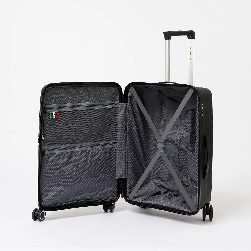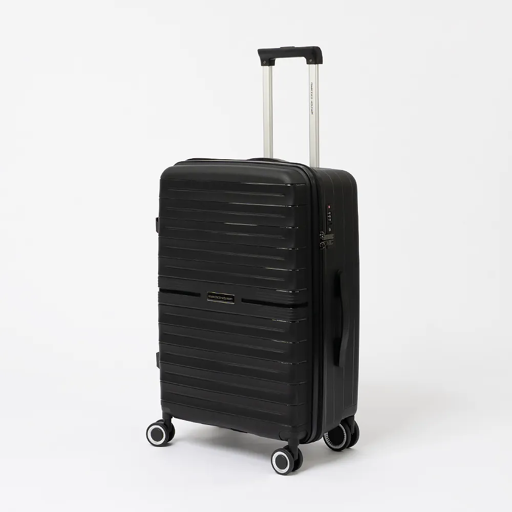 Чемодан-спиннер от торговой марки Francesco Molinary из ударопрочного термостойкого полипропилена с антивандальной узорной поверхностью синего цвета. Модель на четырех сдвоенных пластиковых колесах (задние колеса больше диаметром, чем передние для лучшей маневренности и проходимости), с выдвижной ручкой, ручкой-переноской сверху и сбоку. Закрывается молнией №8 антивор, установлен кодовый замок TSA, встроенный в корпус. Внутри: фирменная подкладка, в одной части - перекрестные ремни для фиксации багажа, в другой - клапан-разделитель на молнии, карман-сетка и карман на молнии. Сбоку имеются крючки для подвешивания сумки или пакета.