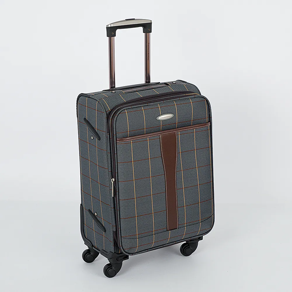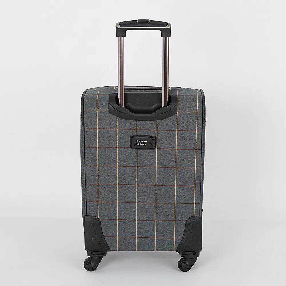 Чемодан от торговой марки Francesco Molinary выполнен из плотного текстильного материала бежевого цвета в коричнево-синюю клетку. Декорирован вставками из искусственной кожи с контрастной отстрочкой. Модель на четырех пластиковых колесах, с выдвижной металлической ручкой с кнопкой, текстильными ручками-переносками сверху и сбоку, пластиковыми ножками-опорами. Закрывается двойной антивандальной молнией, имеется кодовый замок TSA. Внутри: фирменная подкладка, на крышке - карман-сетка на молнии, в глубоком отделении - фиксирующие ремни для багажа. Имеется раздвижка на молнии для увеличения объема. На лицевой стороне - карман на молнии, на задней - адресная бирка.