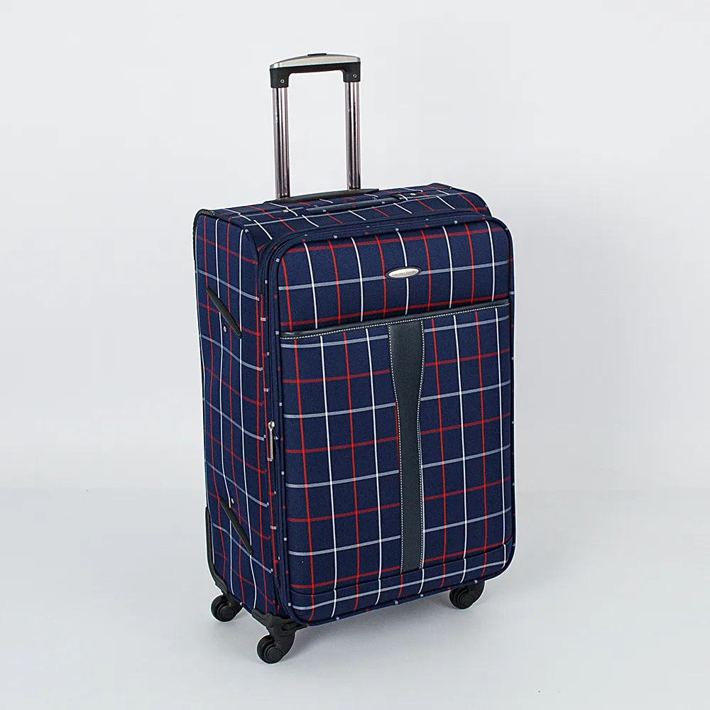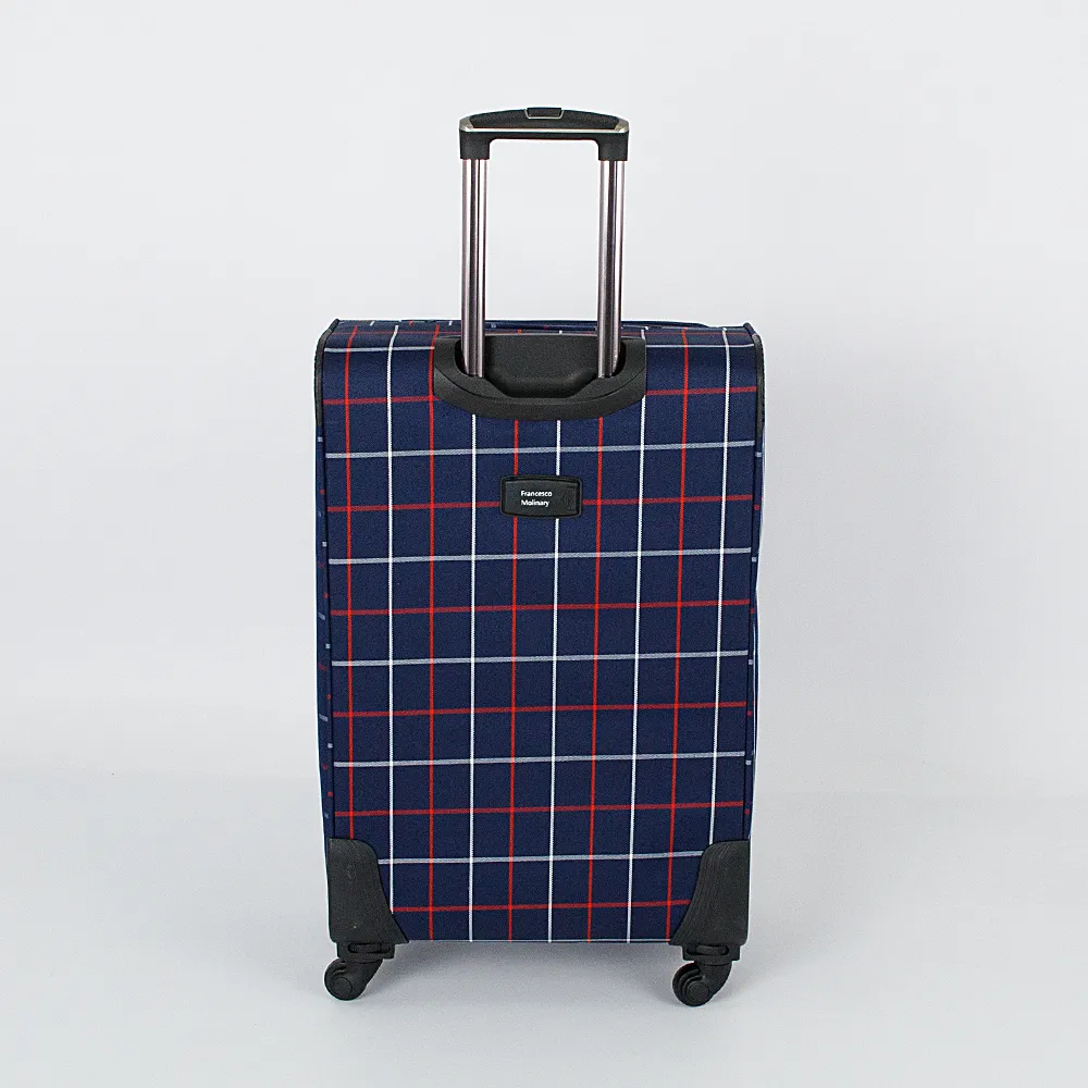Чемодан от торговой марки Francesco Molinary выполнен из плотного текстильного материала бежевого цвета в коричнево-синюю клетку. Декорирован вставками из искусственной кожи с контрастной отстрочкой. Модель на четырех пластиковых колесах, с выдвижной металлической ручкой с кнопкой, текстильными ручками-переносками сверху и сбоку, пластиковыми ножками-опорами. Закрывается двойной антивандальной молнией, имеется кодовый замок TSA. Внутри: фирменная подкладка, на крышке - карман-сетка на молнии, в глубоком отделении - фиксирующие ремни для багажа. Имеется раздвижка на молнии для увеличения объема. На лицевой стороне - карман на молнии, на задней - адресная бирка.