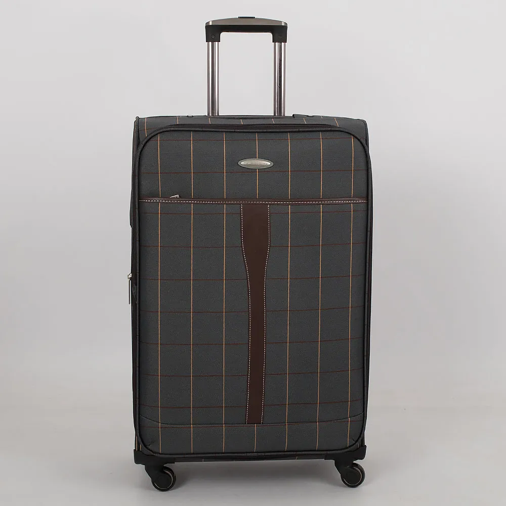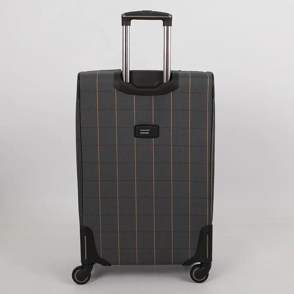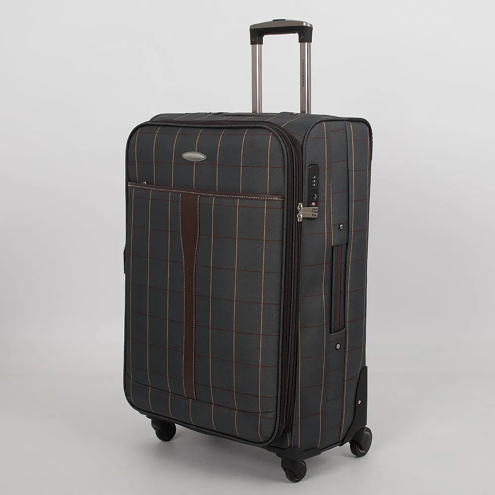 Чемодан от торговой марки Francesco Molinary выполнен из плотного текстильного материала бежевого цвета в коричнево-синюю клетку. Декорирован вставками из искусственной кожи с контрастной отстрочкой. Модель на четырех пластиковых колесах, с выдвижной металлической ручкой с кнопкой, текстильными ручками-переносками сверху и сбоку, пластиковыми ножками-опорами. Закрывается двойной антивандальной молнией, имеется кодовый замок TSA. Внутри: фирменная подкладка, на крышке - карман-сетка на молнии, в глубоком отделении - фиксирующие ремни для багажа. Имеется раздвижка на молнии для увеличения объема. На лицевой стороне - карман на молнии, на задней - адресная бирка.