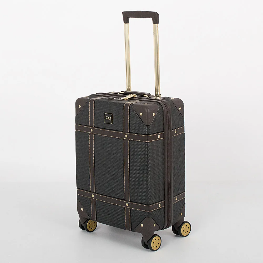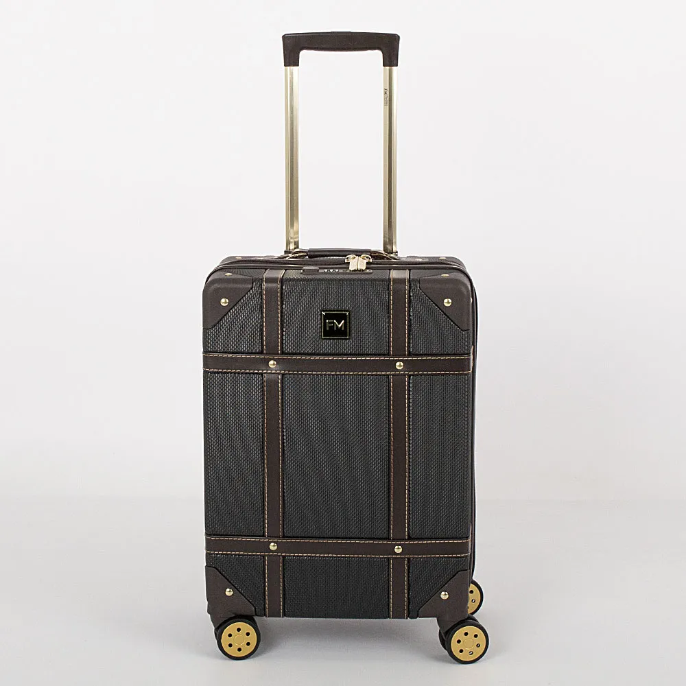 Чемодан-спиннер от торговой марки Francesco Molinary выполнен из ударопрочного ABS-пластика синего цвета. Модель на четырех сдвоенных пластиковых колесах, оснащена выдвижной металлической ручкой с кнопкой, ручками из искусственной кожи сверху и сбоку, пластиковыми ножками сбоку, утопленным в корпус кодовым замком TSA. Двойная антивандальная молния делит чемодан на две равные части, в одной из которых – клапан на молнии с внешним карманом-сеткой на молнии, в другой – перекрестные ремни для фиксации багажа. Углы чемодана укреплены пластиковыми накладками. Модель декорирована фурнитурой золотистого цвета, вставками из искусственной кожи и клепками, придающими эффект брутальности.