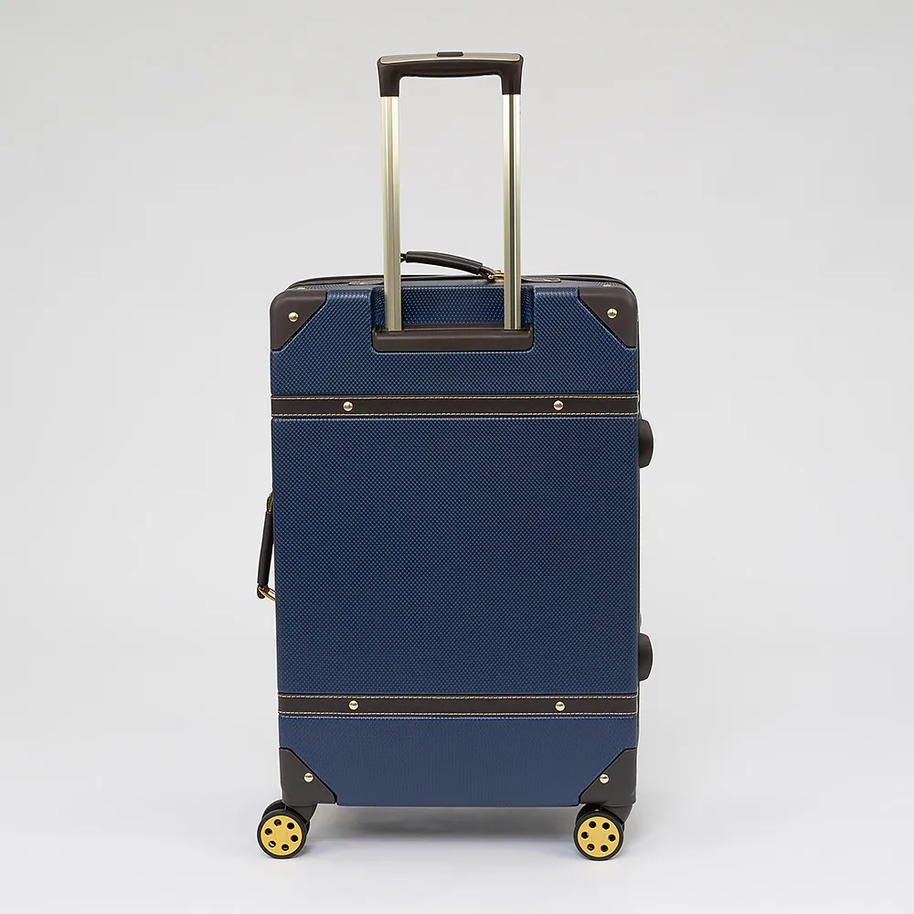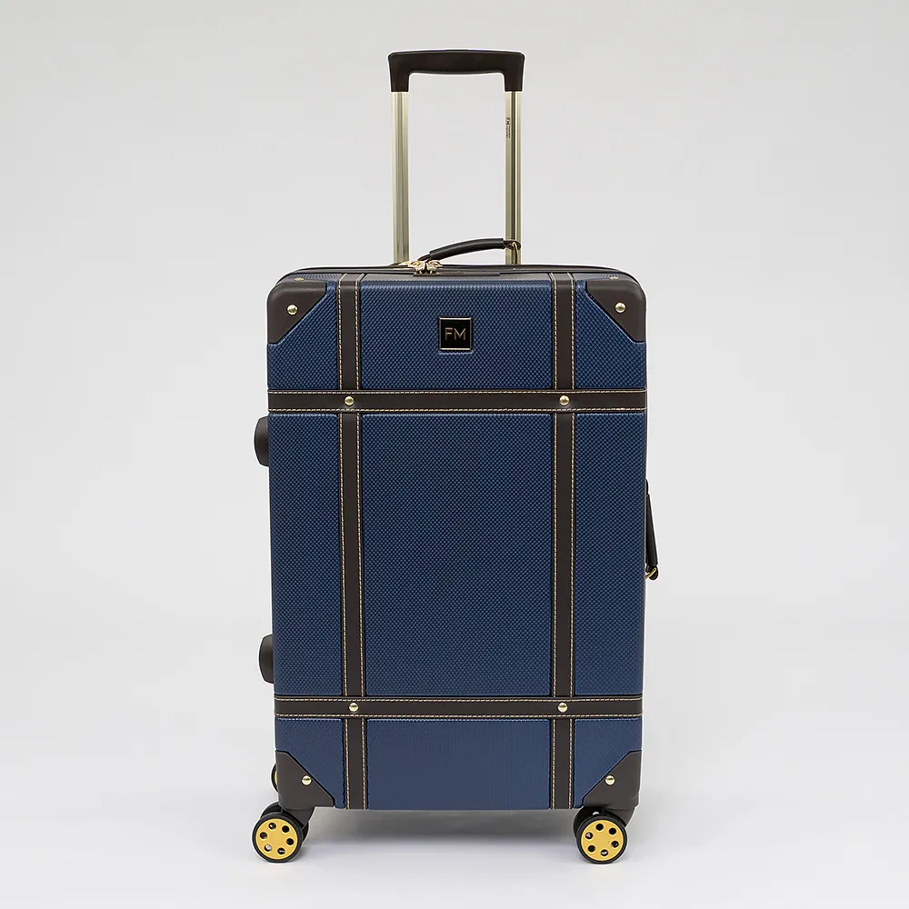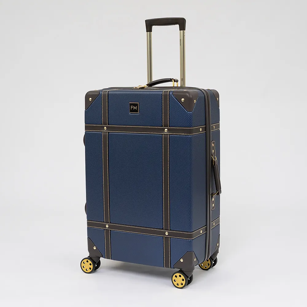 Чемодан-спиннер от торговой марки Francesco Molinary выполнен из ударопрочного ABS-пластика синего цвета. Модель на четырех сдвоенных пластиковых колесах, оснащена выдвижной металлической ручкой с кнопкой, ручками из искусственной кожи сверху и сбоку, пластиковыми ножками сбоку, утопленным в корпус кодовым замком TSA. Двойная антивандальная молния делит чемодан на две равные части, в одной из которых – клапан на молнии с внешним карманом-сеткой на молнии, в другой – перекрестные ремни для фиксации багажа. Углы чемодана укреплены пластиковыми накладками. Модель декорирована фурнитурой золотистого цвета, вставками из искусственной кожи и клепками, придающими эффект брутальности.