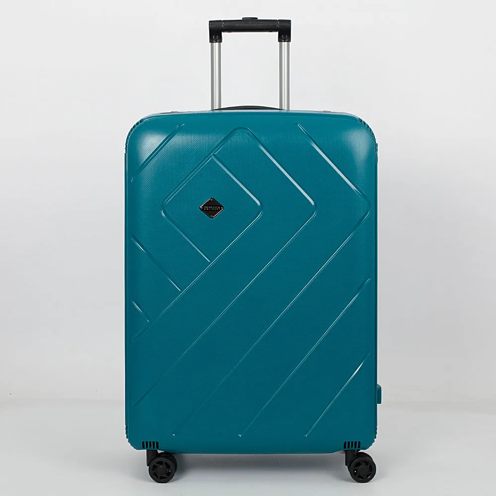 Маневренный чемодан-спиннер от торговой марки Francesco Molinary из ударопрочного полипропилена темно-синего цвета с рельефным узором. Модель на четырех сдвоенных пластиковых колесах, с выдвижной телескопической металлической ручкой с кнопкой, двумя ручками-переносками (верхняя прорезинена). Закрывается четырьмя пластиковыми защелками-клипсами. На клипсах имеются фиксаторы закрытия, верхняя клипса оснащена встроенным замком TSA. Внутри: фирменная подкладка, в обеих частях имеются эластичные фиксирующие ремни для багажа; одна из частей закрывается плотной перегородкой с карманом-сеткой на молнии. На задней стороне – адресная бирка.