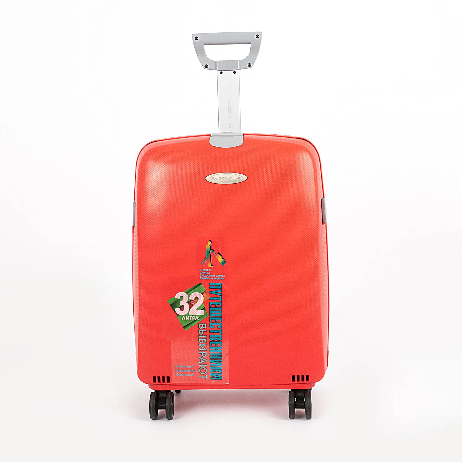 Чемодан-спиннер от торговой марки Francesco Molinary из ударопрочного термостойкого полипропилена красного цвета с антивандальной по верхностью. Модель на четырех сдвоенных пластиковых колесах, с выдвижной алюминиевой ручкой, ручками-переносками сверху и сбоку. Закрывается четырьмя защелками; две боковые защелки оснащены кодовым замком, верхняя и нижняя дополнительно закрываются на ключ. Внутри: фирменный подклад из полиэстера плотностью 210 Ден; в одной части – перекрестные ремни для фиксации багажа, в другой – клапан-разделитель на молнии с карманом-сеткой на молнии. Натяжение подкладки в основной части чемодана обеспечивает плотное прилегание. Подкладка закреплена скобами и дополнительно фиксируется липкой лентой, а также держателями ремней для багажа. Имеется адресная бирка. Чемоданы из полипропилена обладают отличными эксплуатационными свойствами. Как правило, у изделий из этого материала отсутствует подкладка. Превосходное внутреннее наполнение чемодана, включая фирменную подкладку, выгодно отличает модель бренда Francesco Molinary.