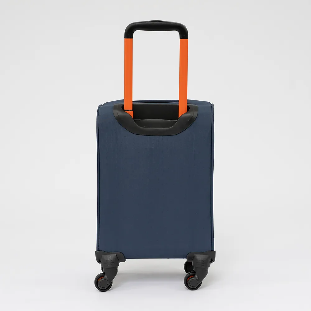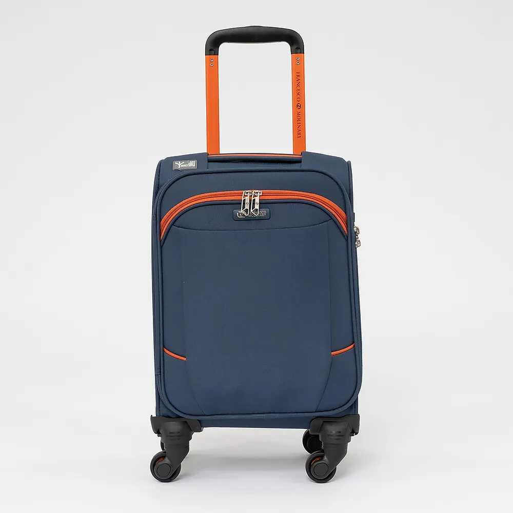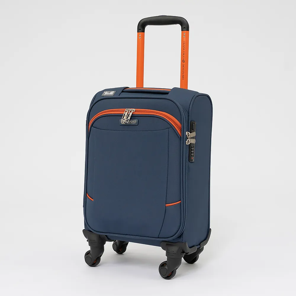 Облегченный чемодан-спиннер от торговой марки Francesco Molinary из практичного полиэстера с водоотталкивающей пропиткой синего цвета с оранжевыми деталями. Модель на четырех одинарных колесах, с выдвижной телескопической ручкой и ручкой-переноской сверху, имеется кодовый замок TSA. Отделение на молнии. Внутри: фирменная подкладка. На крышке – карман на молнии, в глубоком отделении – эластичные ремни для фиксации багажа. На лицевой стороне – карман на молнии.