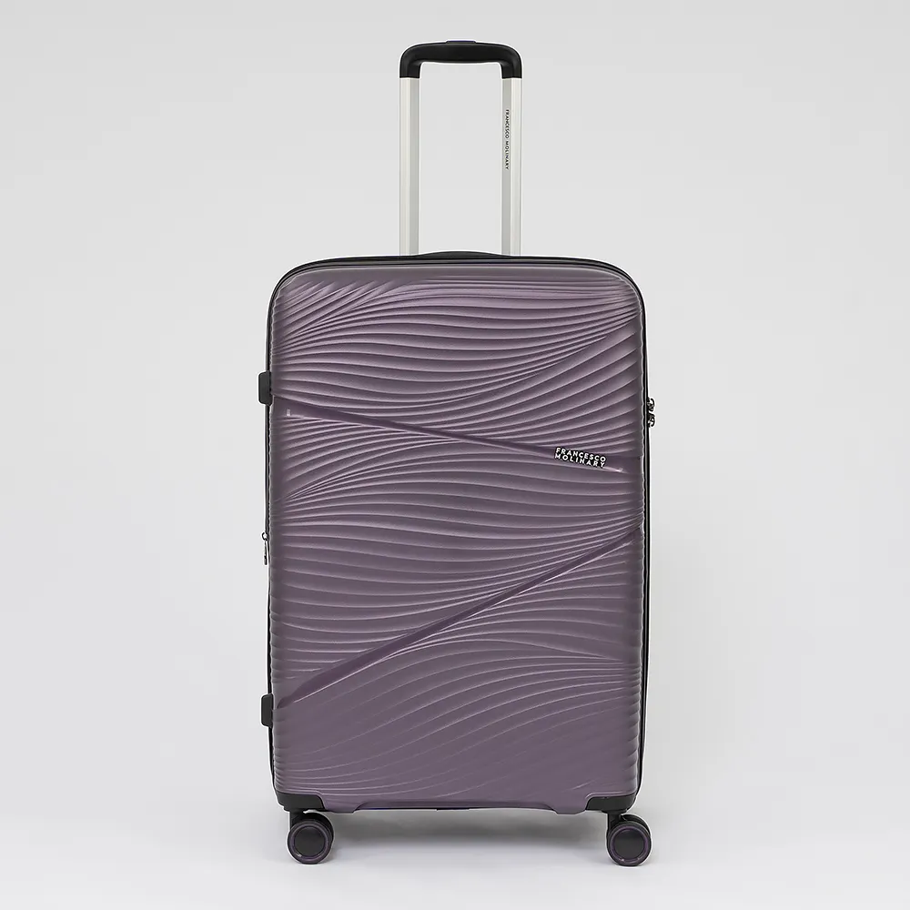 Чемодан-спиннер от торговой марки Francesco Molinary из ударопрочного полипропилена сиреневого цвета с рельефной поверхностью, имитирующей изящную драпировку. Модель на четырех сдвоенных пластиковых колесах, с выдвижной ручкой с кнопкой и алюминиевыми трубками, ручками-переносками сверху и сбоку, пластиковыми ножками-опорами сбоку. Закрывается двойной антивандальной молнией; имеется кодовый замок TSA, встроенный в корпус, и раздвижка на молнии для увеличения объема. Внутри: уплотненная фирменная подкладка; в одной части – клапан-разделитель на молнии, карман-сетка, два вместительных накладных кармана, в другой части – перекрестные ремни для фиксации багажа, посередине – навесной карман на молнии.