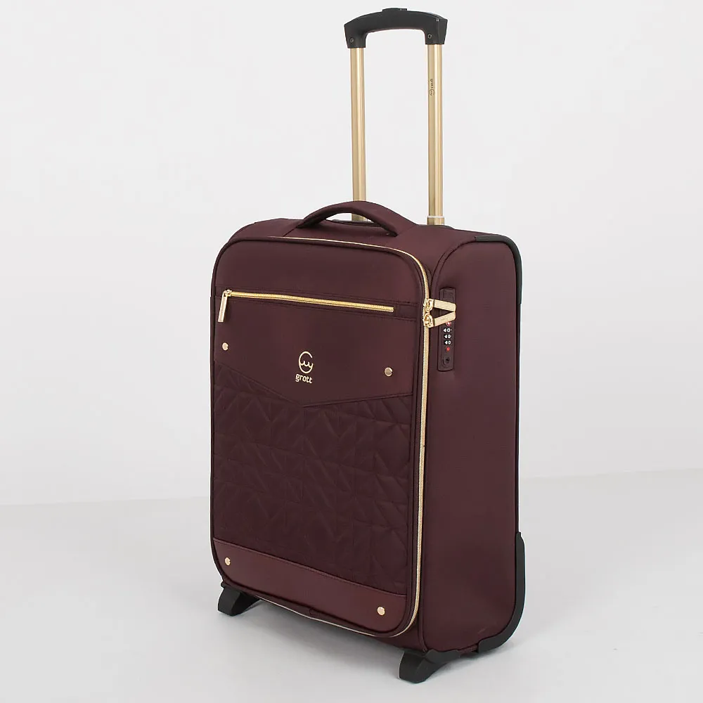 Чемодан-спиннер от торговой марки Grott из прочного текстильного материала зеленого цвета. Модель на четырех пластиковых колесах, с выдвижной ручкой с железными трубками, ручками-переносками сверху и сбоку. Закрывается молнией золотистого цвета; имеется замок TSA, утопленный в корпус. Внутри: фирменная подкладка плотностью 210 Ден; на крышке – два кармана на молнии, в том числе карман-сетка; в глубоком отделении – ремни для фиксации багажа. На лицевой стороне – карман на молнии; вставка, декорированная мягкой стежкой. Верхние углы креплены пластиковыми накладками для защиты от износа. Имеется раздвижка на молнии для увеличения объема.