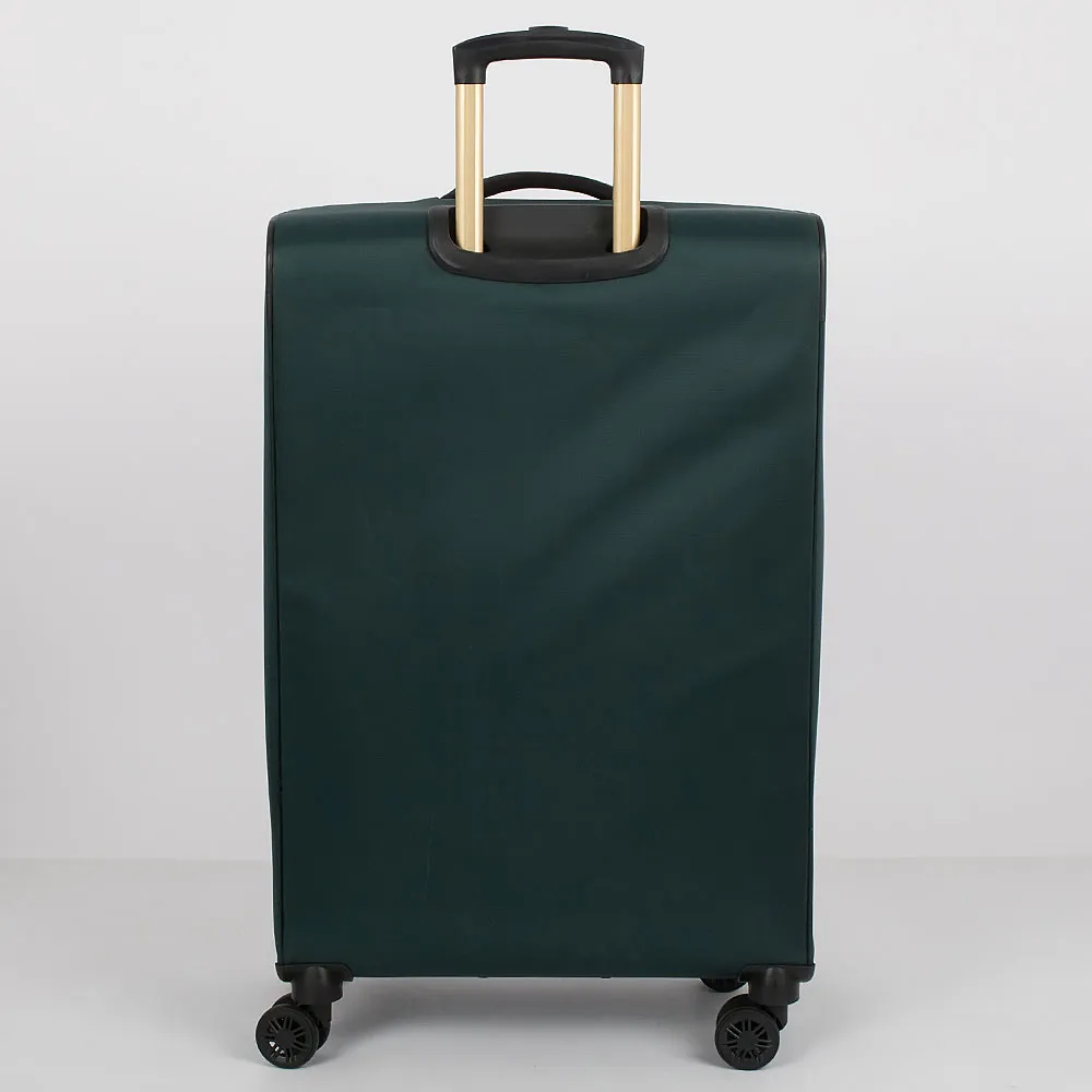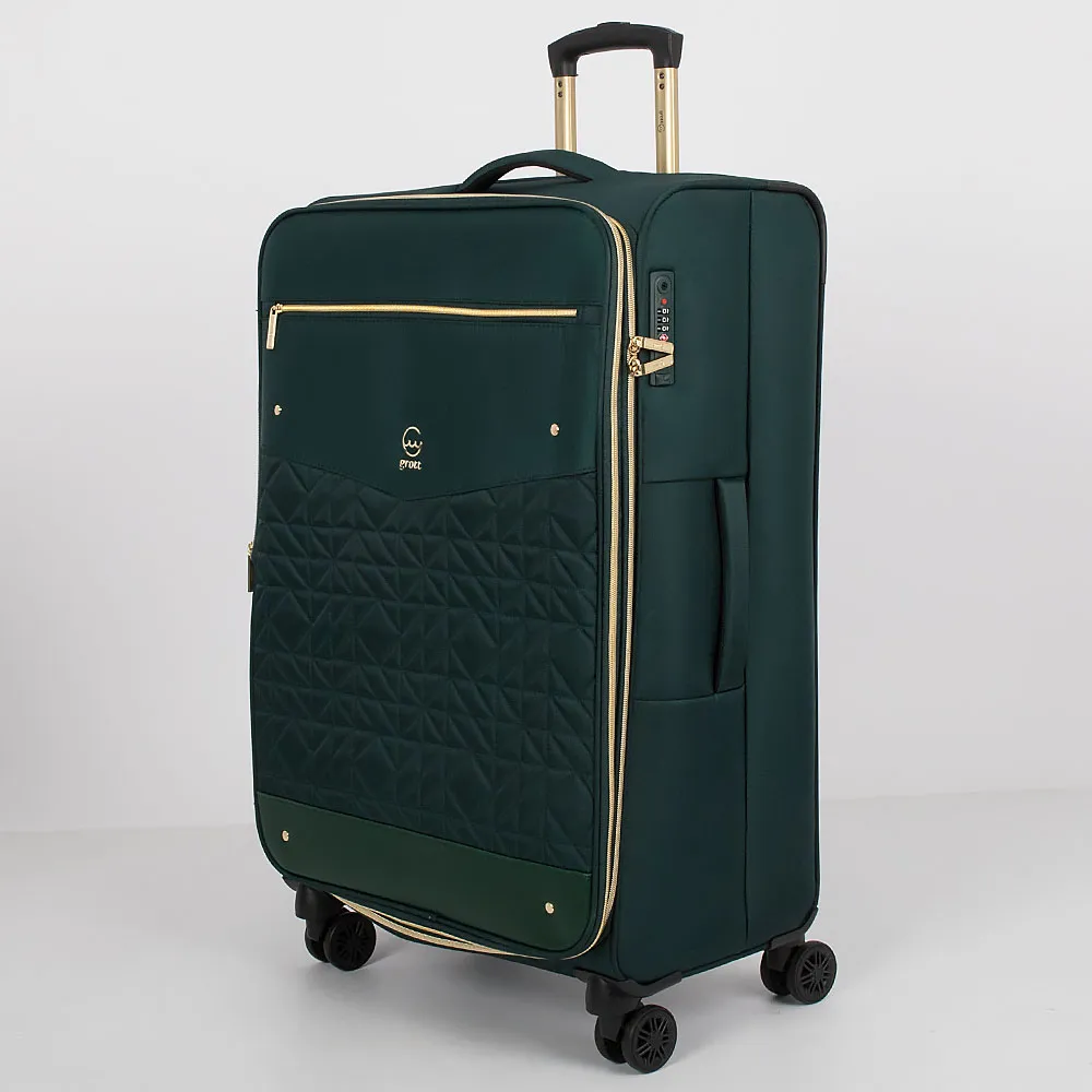 Чемодан-спиннер от торговой марки Grott из прочного текстильного материала зеленого цвета. Модель на четырех пластиковых колесах, с выдвижной ручкой с железными трубками, ручками-переносками сверху и сбоку. Закрывается молнией золотистого цвета; имеется замок TSA, утопленный в корпус. Внутри: фирменная подкладка плотностью 210 Ден; на крышке – два кармана на молнии, в том числе карман-сетка; в глубоком отделении – ремни для фиксации багажа. На лицевой стороне – карман на молнии; вставка, декорированная мягкой стежкой. Верхние углы креплены пластиковыми накладками для защиты от износа. Имеется раздвижка на молнии для увеличения объема.