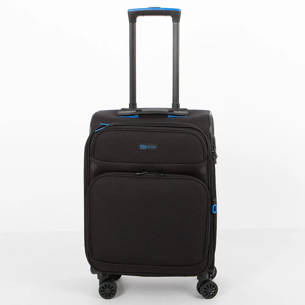 Чемодан-спиннер от торговой марки Francesco Molinary из практичного полиэстера плотностью 900 Ден с влагостойкой пропиткой в черном цвете. Модель на четырех сдвоенных колесах, с выдвижной ручкой с железными трубками, прорезиненной ручкой-переноской сверху и ручкой сбоку, держателем на дне. Закрывается двойной антивандальной молнией; имеется кодовый замок TSA и раздвижка на молнии для увеличения объема. Верхние углы укреплены прорезиненными накладками. Внутри: уплотненная фирменная подкладка; на крышке – карман-сетка на молнии, в глубоком отделении – фиксирующие ремни для багажа. На лицевой стороне – два кармана на молнии.