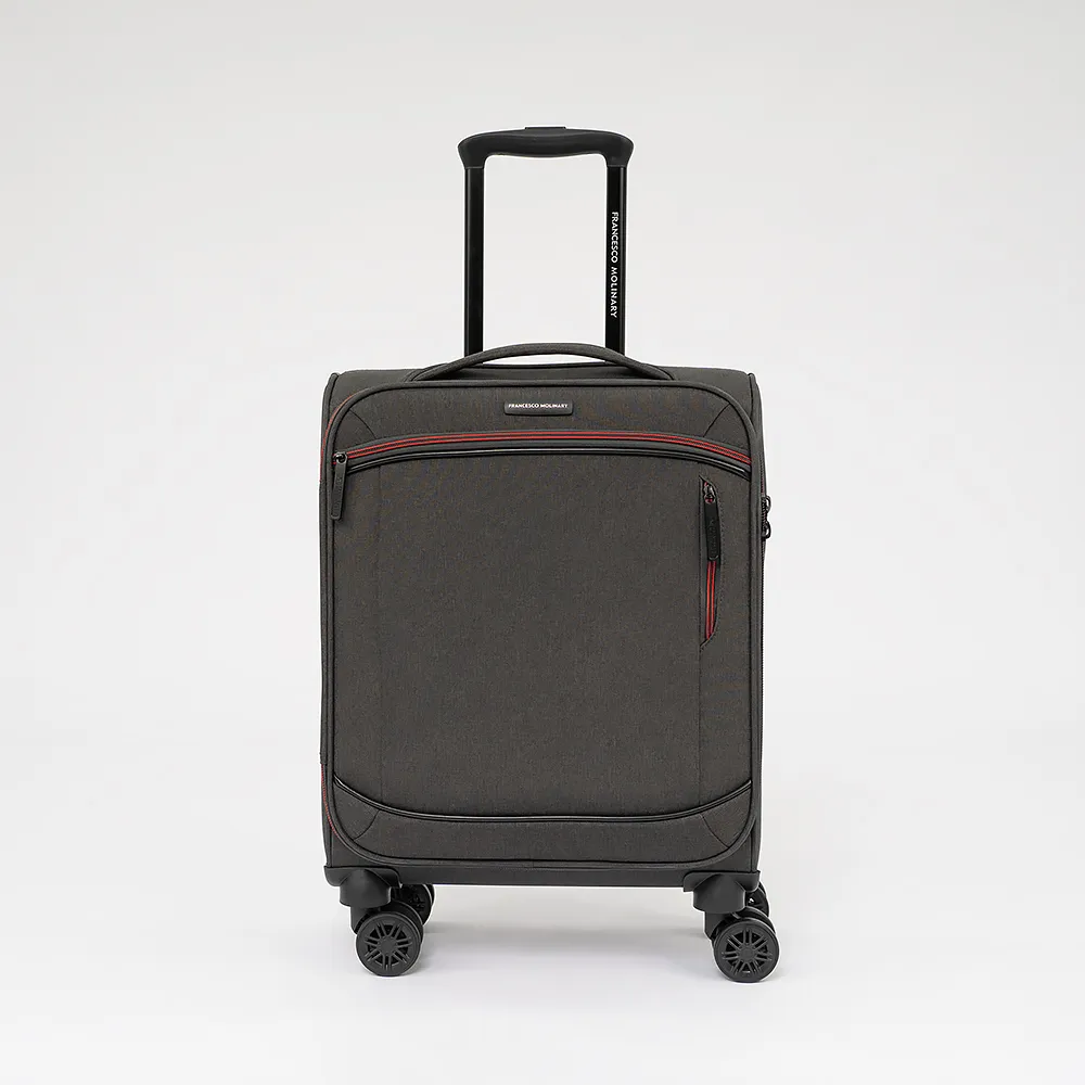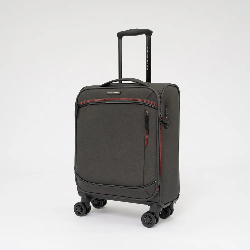 Чемодан-спиннер от торговой марки Francesco Molinary из прочного практичного текстильного материала черного цвета. Модель на четырех сдвоенных колесах, с выдвижной ручкой с кнопкой, ручками-переносками сверху и сбоку. Закрывается крупной молнией, имеется кодовый замок TSA, утопленный в корпус. Внутри: фирменная подкладка, в глубоком отделении - фиксирующие ремни для багажа, на крышке - два кармана на молнии, в том числе карман-сетка. Верхние углы защищены прорезиненными накладками. Имеется раздвижка на молнии для увеличения объема. На лицевой стороне - два кармана на молнии.