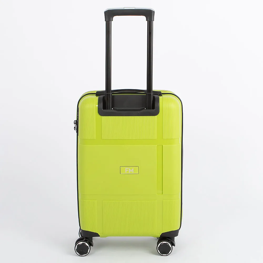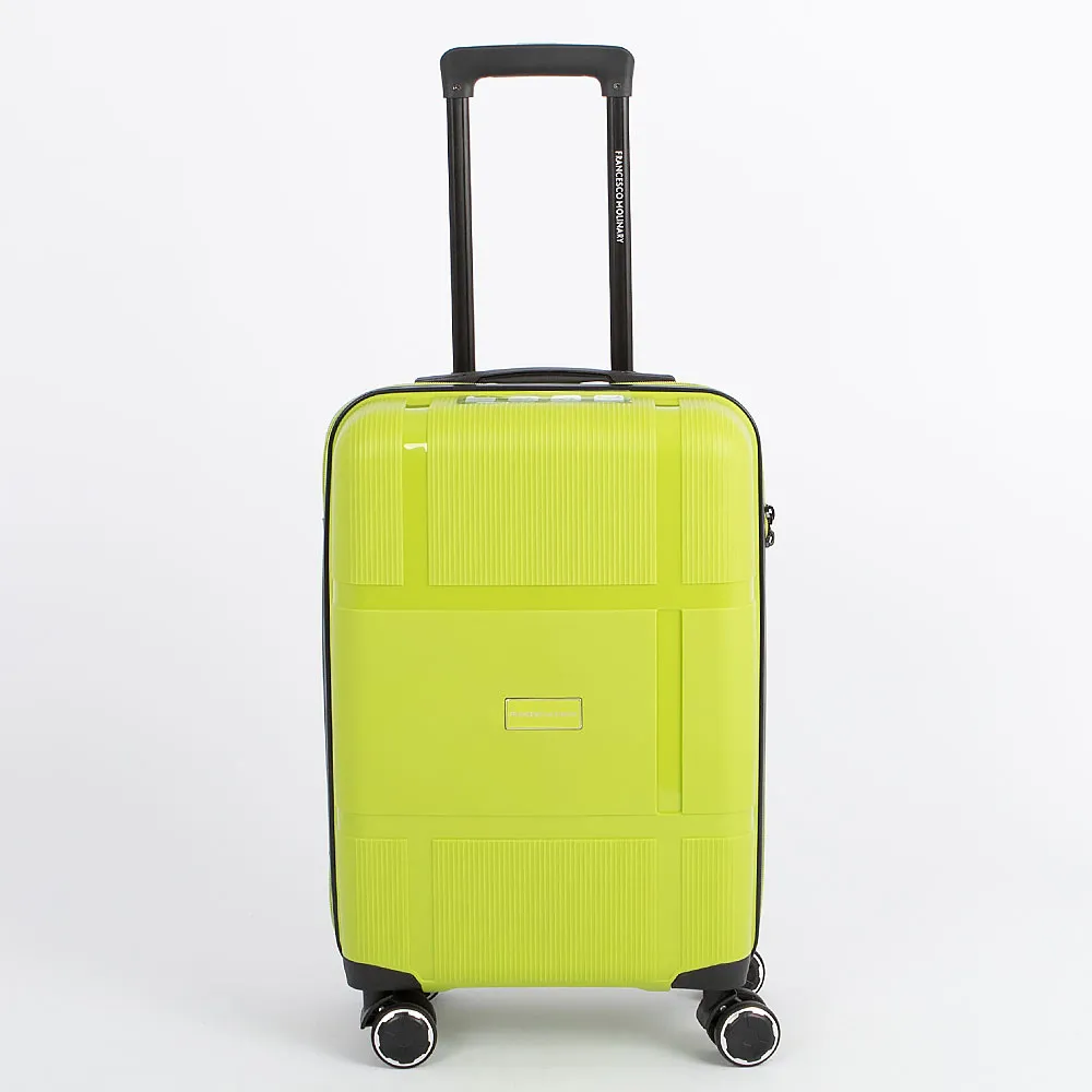 Чемодан-спиннер от торговой марки Francesco Molinary из ударопрочного термостойкого полипропилена с антивандальной узорной поверхностью разной фактуры в черном цвете. Модель на четырех сдвоенных пластиковых колесах, с выдвижной ручкой с железными трубками, ручкой-переноской сверху. Закрывается двойной антивандальной молнией; имеется кодовый замок TSA, встроенный в корпус. Внутри: фирменная подкладка плотностью 210 Ден; в одной части – перекрестные ремни для фиксации багажа, в другой – клапан-разделитель на молнии. Размер подходит в качестве ручной клади для большинства авиакомпаний.
