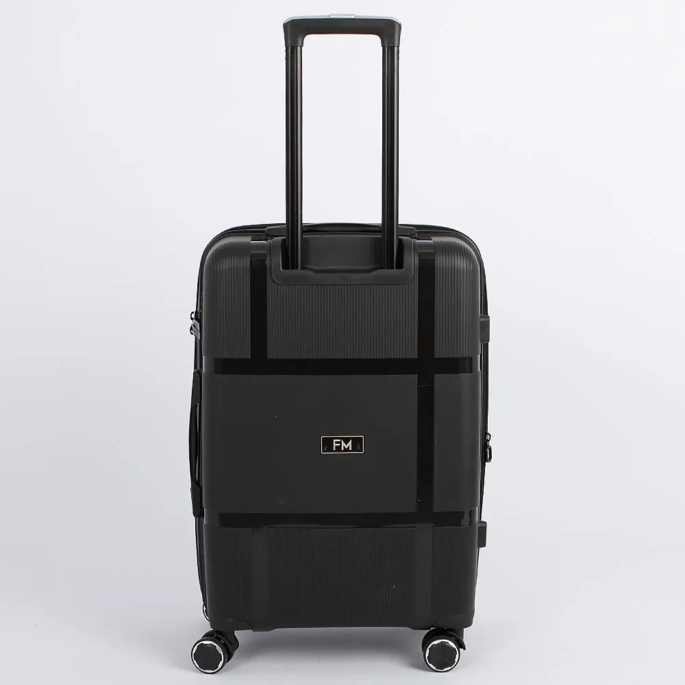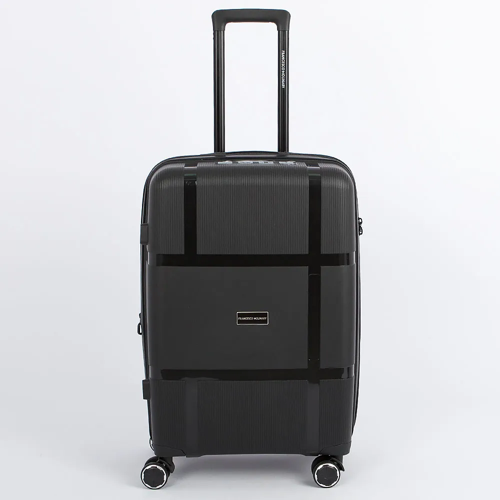 Чемодан-спиннер от торговой марки Francesco Molinary из ударопрочного термостойкого полипропилена с узорной поверхностью разной фактуры в салатовом цвете. Модель на четырех сдвоенных пластиковых колесах, с выдвижной ручкой с железными трубками, ручками-переносками сверху и снизу, пластиковыми ножками-опорами сбоку с крючком для ручной клади. Закрывается двойной антивандальной молнией; имеется кодовый замок TSA, встроенный в корпус. Внутри: фирменная подкладка плотностью 210 Ден; в одной части – перекрестные ремни для фиксации багажа, в другой – клапан-разделитель на молнии. Имеется раздвижка на молнии для увеличения объема.