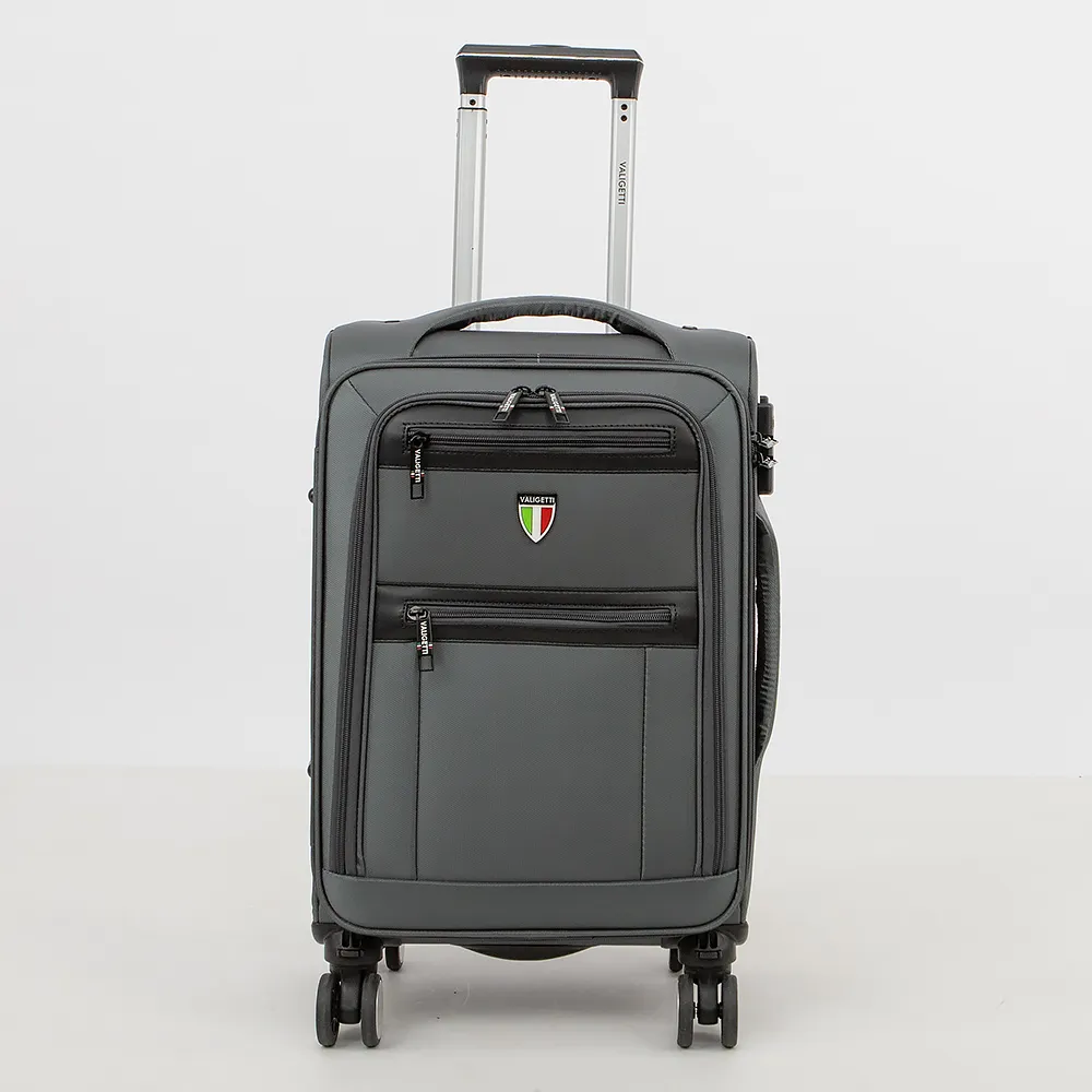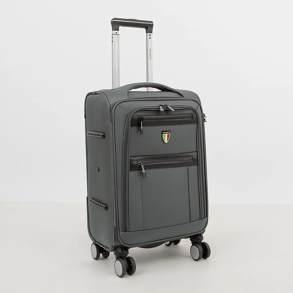 Чемодан-спиннер от торговой марки Valigetti из прочного текстильного материала синего цвета. Декорирован деталями в цвете итальянского флага. Модель на четырех сдвоенных прорезиненных съемных колесах, с выдвижной ручкой, двумя ручками, укрепленными хольнитенами, ручкой-держателем на дне, ножками-опорами сбоку. Верхние углы защищены прорезиненными накладками, нижняя часть – пластиковыми накладками. Закрывается молнией; имеется кодовый замок с выдвижным адресным окном. Внутри: фирменная подкладка с поролоновой вставкой. В глубоком отделении – фиксирующие ремни для багажа; на крышке – два кармана на молнии. На лицевой стороне – вместительный карман-отделение, два кармана на молнии. На спинке – выдвижное адресное окошко. Имеется раздвижка на молнии для увеличения объема.