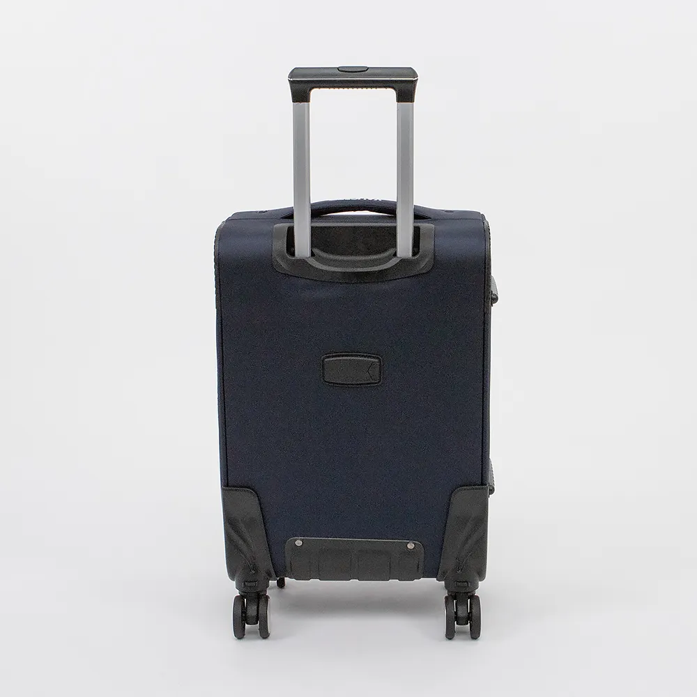 Чемодан-спиннер от торговой марки Valigetti из прочного текстильного материала синего цвета. Декорирован деталями в цвете итальянского флага. Модель на четырех сдвоенных прорезиненных съемных колесах, с выдвижной ручкой, двумя ручками, укрепленными хольнитенами, ручкой-держателем на дне, ножками-опорами сбоку. Верхние углы защищены прорезиненными накладками, нижняя часть – пластиковыми накладками. Закрывается молнией; имеется кодовый замок с выдвижным адресным окном. Внутри: фирменная подкладка с поролоновой вставкой. В глубоком отделении – фиксирующие ремни для багажа; на крышке – два кармана на молнии. На лицевой стороне – вместительный карман-отделение, два кармана на молнии. На спинке – выдвижное адресное окошко. Имеется раздвижка на молнии для увеличения объема.