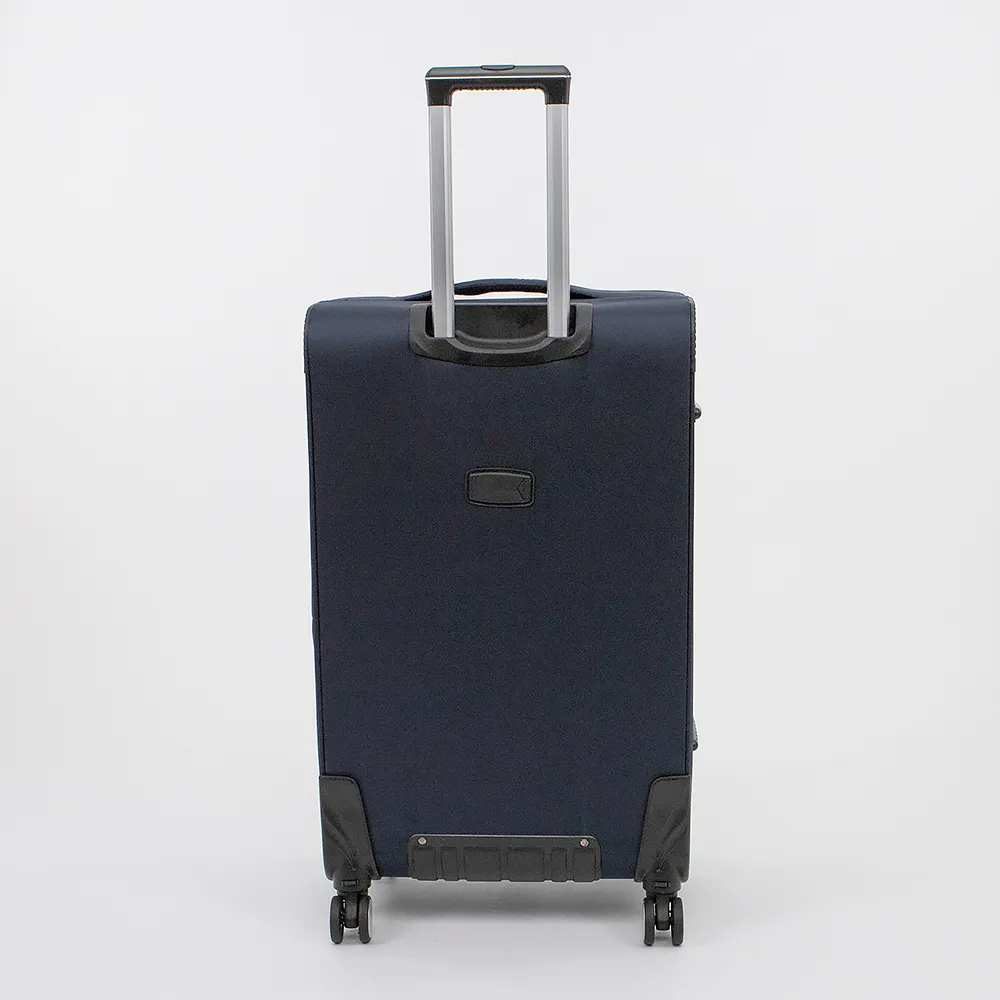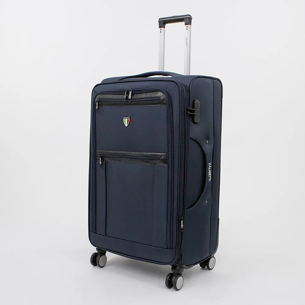 Чемодан-спиннер от торговой марки Valigetti из прочного текстильного материала синего цвета. Декорирован деталями в цвете итальянского флага. Модель на четырех сдвоенных прорезиненных съемных колесах, с выдвижной ручкой, двумя ручками, укрепленными хольнитенами, ручкой-держателем на дне, ножками-опорами сбоку. Верхние углы защищены прорезиненными накладками, нижняя часть – пластиковыми накладками. Закрывается молнией; имеется кодовый замок с выдвижным адресным окном. Внутри: фирменная подкладка с поролоновой вставкой. В глубоком отделении – фиксирующие ремни для багажа; на крышке – два кармана на молнии. На лицевой стороне – вместительный карман-отделение, два кармана на молнии. На спинке – выдвижное адресное окошко. Имеется раздвижка на молнии для увеличения объема.