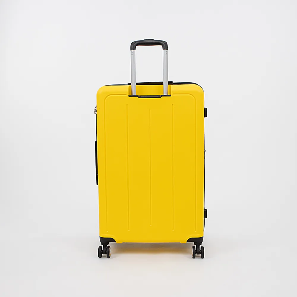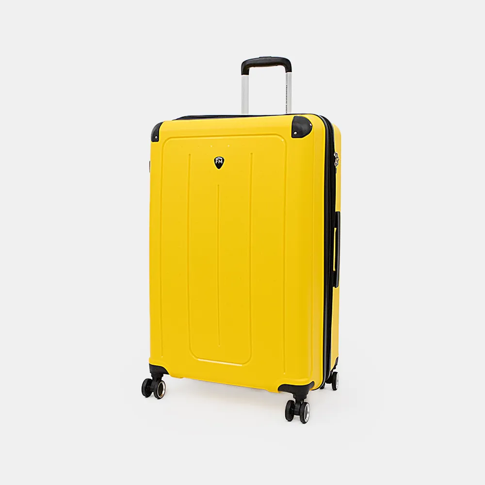Маневренный чемодан-спиннер от торговой марки Francesco Molinary выполнен из ударопрочного полипропилена в желтом цвете. Модель на четырех сдвоенных пластиковых колесах, с выдвижной телескопической ручкой, прорезиненной ручкой-переноской сверху и сбоку; пластиковыми ножками сбоку. Отделение на молнии с двумя встречными бегунками с отверстиями для навесного замка, не входящего в комплект; имеется кодовый замок, утопленный в корпус. Закрывается на двойную антивандальную молнию «антивор». Внутри: фирменная подкладка, в одной части – клапан-разделитель и карман-сетка на молнии, в другой – перекрестные фиксирующие ремни для багажа; посередине имеется карман на молнии. В верхней части чемодан укреплен пластиковыми угловыми накладками. Имеется раздвижка на молнии для увеличения объема.
