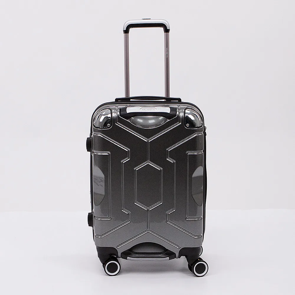 Маневренный чемодан-спиннер от торговой марки Valigetti из ударопрочного пластика ABS и поликарбоната, облегчающего конструкцию. Модель в зеленом цвете с эффектным рельефным рисунком; металлическая выдвижная ручка, четыре ручки переноски, пластиковые ножки-опоры сбоку, двойные съемные прорезиненные колеса, обеспечивающие плавный бесшумный ход. Закрывается молнией; имеется кодовый замок, утопленный в корпус. Внутри: фирменная подкладка, в одной части – перекрестные ремни для фиксации багажа, в другой – клапан-разделитель на молнии. Имеется раздвижка на молнии для увеличения объема.