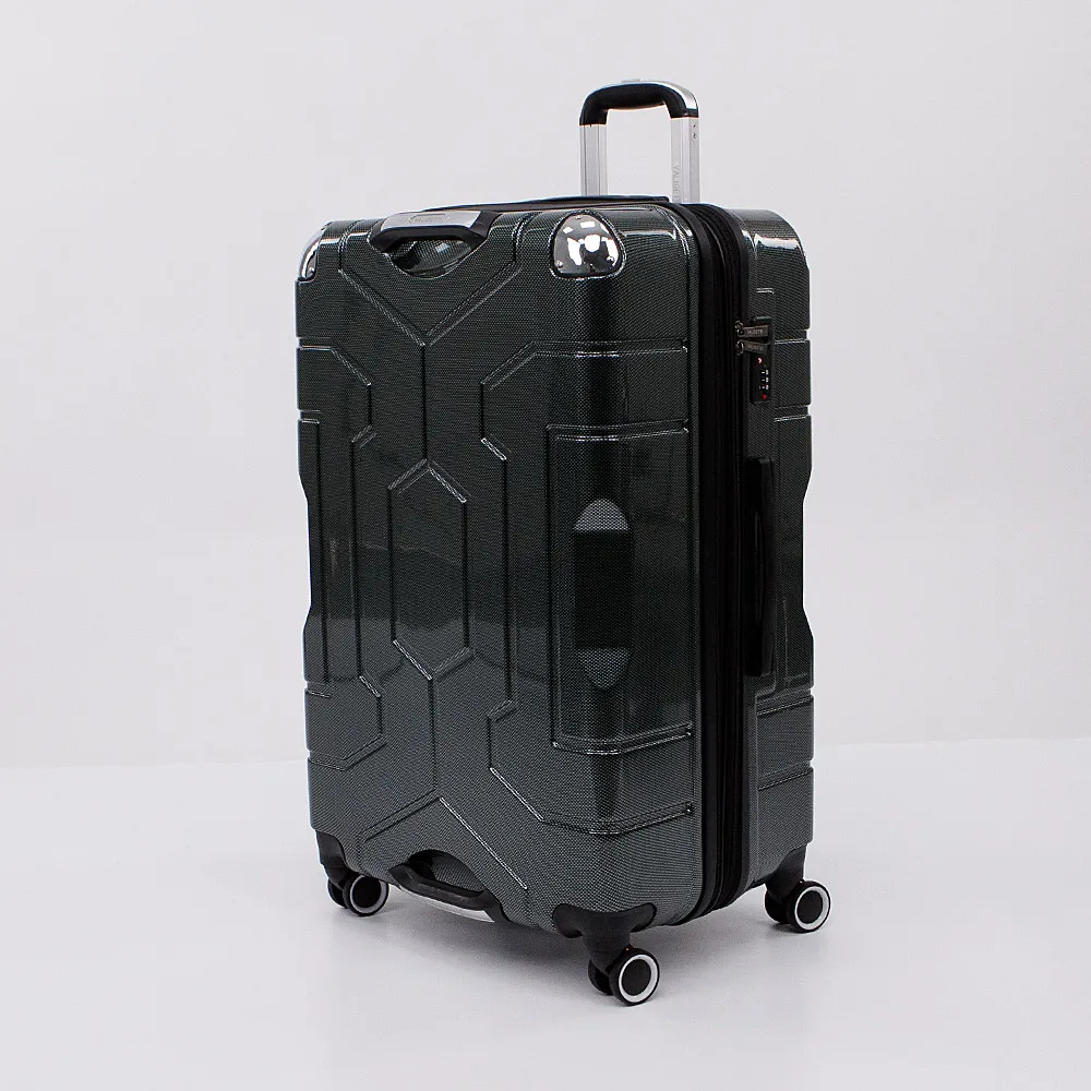 Маневренный чемодан-спиннер от торговой марки Valigetti из ударопрочного пластика ABS и поликарбоната, облегчающего конструкцию. Модель в зеленом цвете с эффектным рельефным рисунком; металлическая выдвижная ручка, четыре ручки переноски, пластиковые ножки-опоры сбоку, двойные съемные прорезиненные колеса, обеспечивающие плавный бесшумный ход. Закрывается молнией; имеется кодовый замок, утопленный в корпус. Внутри: фирменная подкладка, в одной части – перекрестные ремни для фиксации багажа, в другой – клапан-разделитель на молнии. Имеется раздвижка на молнии для увеличения объема.