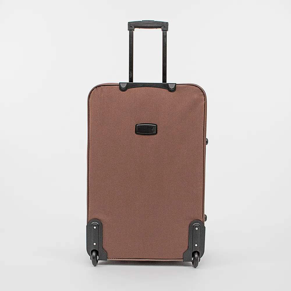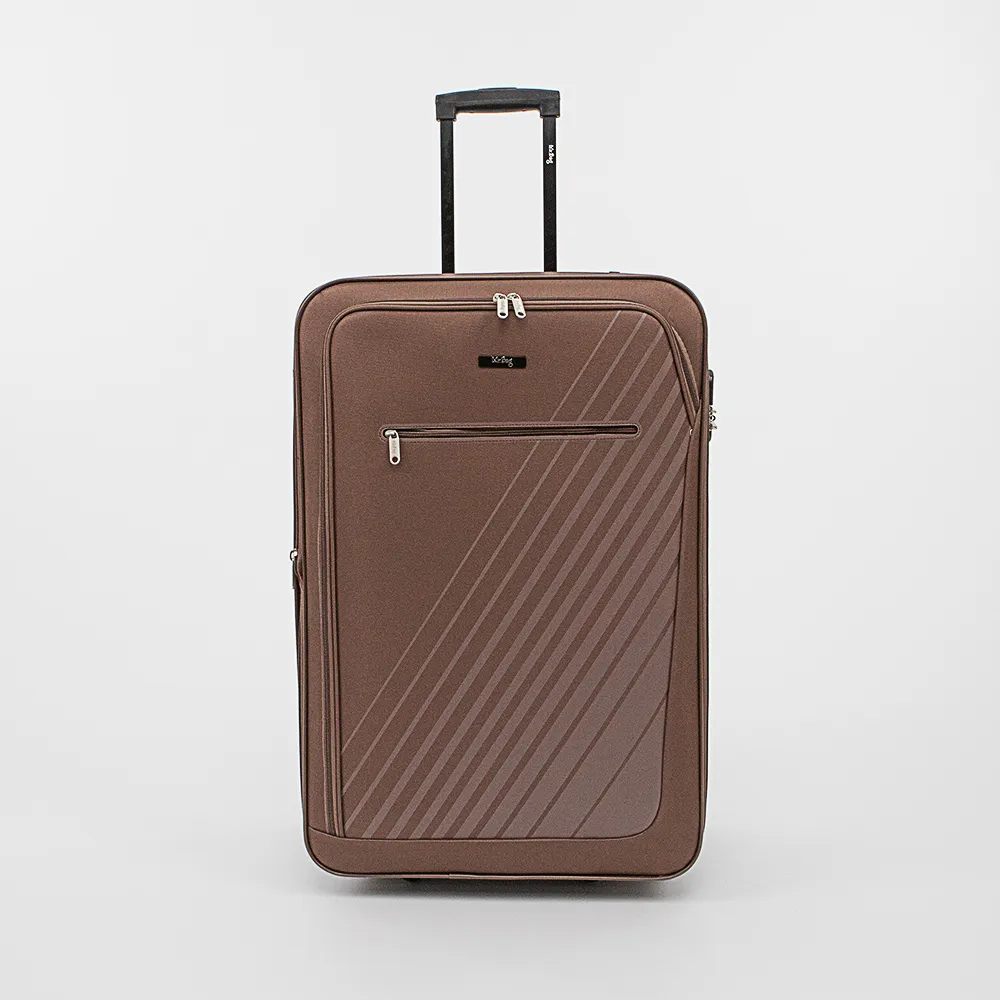 Чемодан от торговой марки Mr.Bag из практичного текстильного материала коричневого цвета. Модель апрайт на двух пластиковых колесах, с выдвижной ручкой, ручками-переносками сверху и сбоку, держателем на дне, пластиковыми ножками на дне и сбоку. Закрывается молнией с двумя встречными бегунками и отверстиями для навесного замка, не входящего в комплект; имеется накладной кодовый замок. Внутри: фирменная подкладка; в глубоком отделении – фиксирующие багажные ремни, на крышке – карман-сетка на молнии. На лицевой стороне – два кармана на молнии. На задней стороне – адресное окошко.