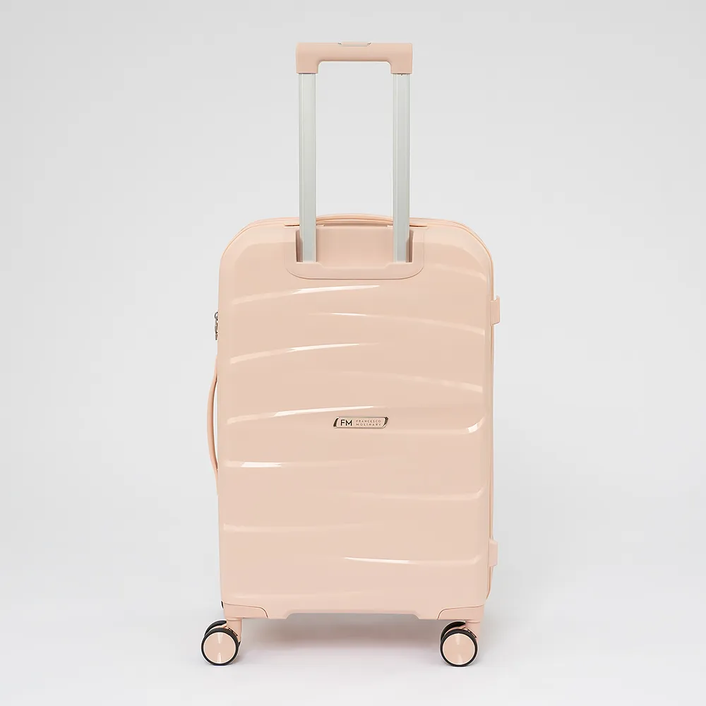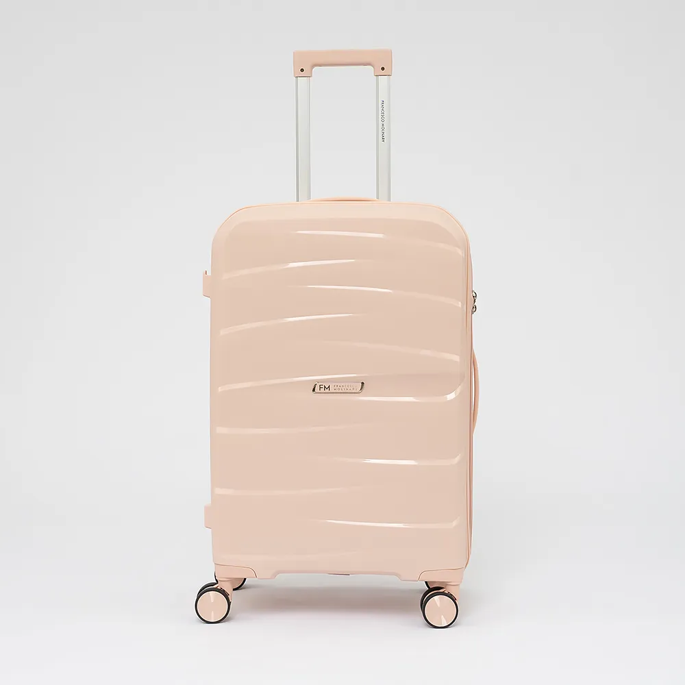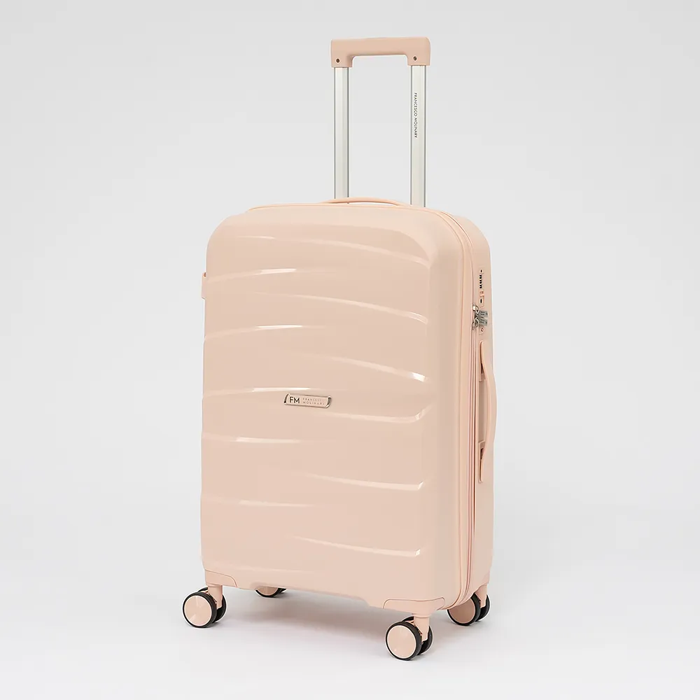 Чемодан-спиннер от торговой марки Francesco Molinary из ударопрочного термостойкого полипропилена с рельефной поверхностью в светло-розовом цвете. Модель на четырех сдвоенных пластиковых колесах с прорезиненной поверхностью, что обеспечивает плавный бесшумный ход, с выдвижной телескопической ручкой, ручками-переносками сверху и сбоку, пластиковыми ножками-опорами сбоку, верхние ножки выполнены в виде крючков для подвешивания. Закрывается двойной антивандальной молнией антивор, кодовый замок TSA утоплен в корпус. Внутри: фирменная подкладка, в одной части - клапан-разделитель на молнии, карман-сетка на молнии, непромокаемый карман на молнии, в другой - перекрестные ремни для фиксации багажа. С обеих сторон имеется фирменный логотип с названием бренда.
