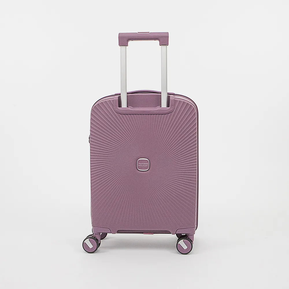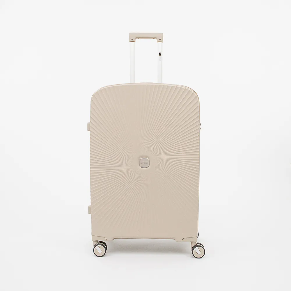 Чемодан-спиннер от торговой марки Francesco Molinary из ударопрочного термостойкого полипропилена бежевого цвета с оригинальной рельефной поверхностью. Модель с закругленными углами, на четырех сдвоенных колесах, с выдвижной алюминиевой ручкой, ручками-переносками сверху и сбоку, пластиковыми ножками-опорами сбоку. Закрывается двойной антивандальной молнией «антивор»; имеется кодовый замок TSA, утопленный в корпус. Внутри: плотная фирменная подкладка; в одной части – перекрестные ремни для фиксации багажа, в другой – клапан-разделитель на молнии, карман-сетка на молнии, водонепроницаемый карман на молнии.