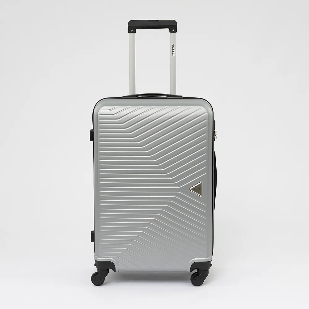 Чемодан-спиннер от торговой марки Valigetti из ударопрочного ABS-пластика с рельефной поверхностью желтого цвета. Модель на четырех съемных пластиковых колесах, с выдвижной ручкой, ручками-переносками сверху и сбоку, ножками-опорами сбоку. Имеется кодовый замок. Отделение на молнии с двумя встречными бегунками с ушками для навесного замка, не входящего в комплект. Внутри: фирменная подкладка. В одном отделении - разделитель на молнии и карман-сетка на молнии, в другом - перекрестные ремни для фиксации багажа.